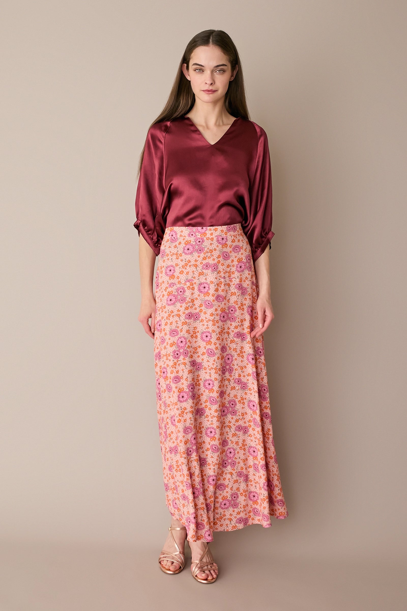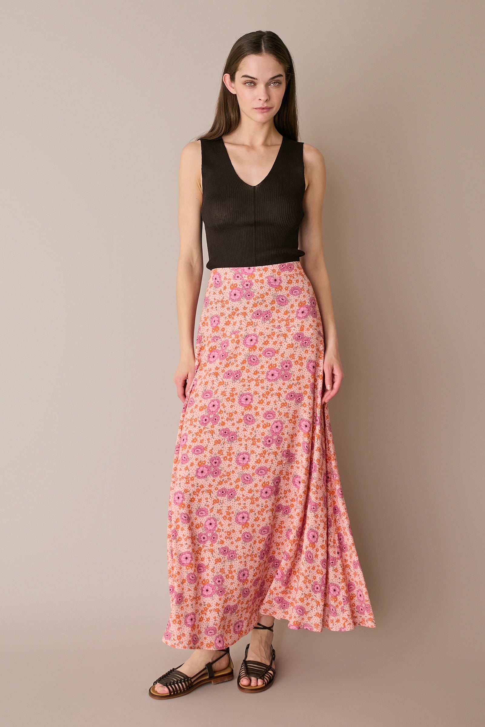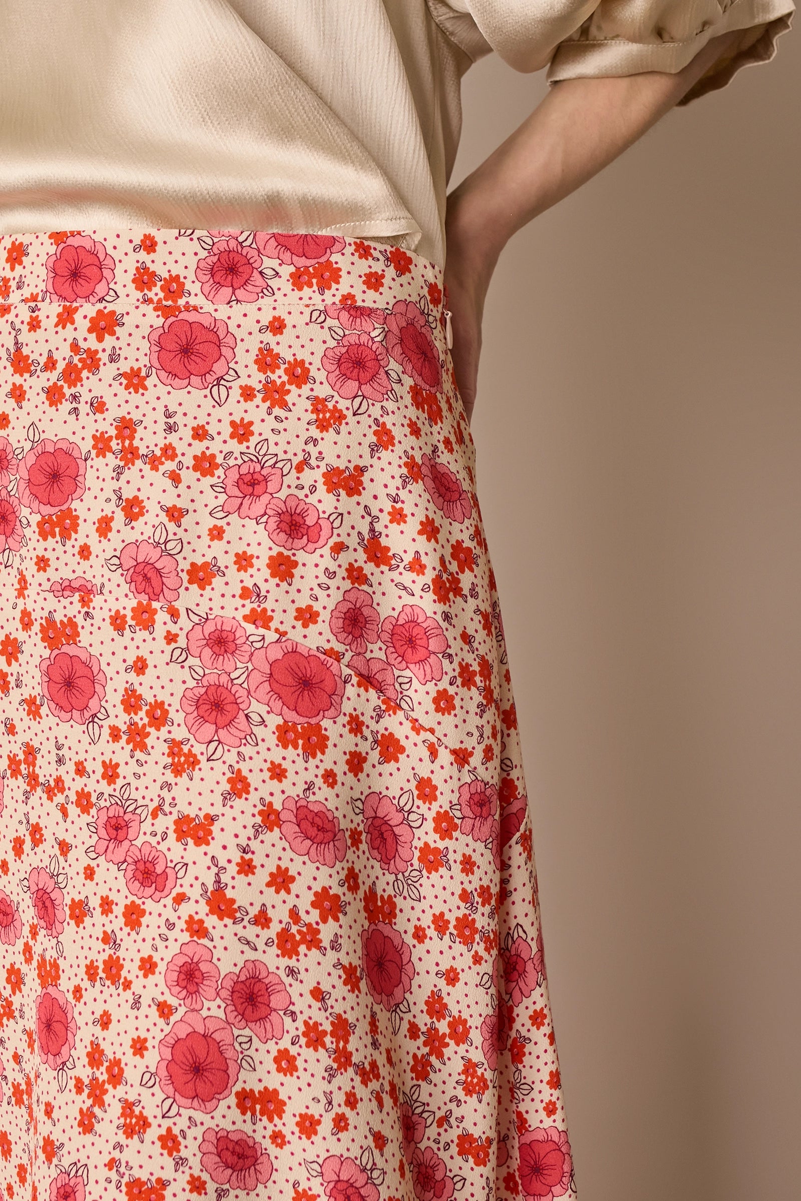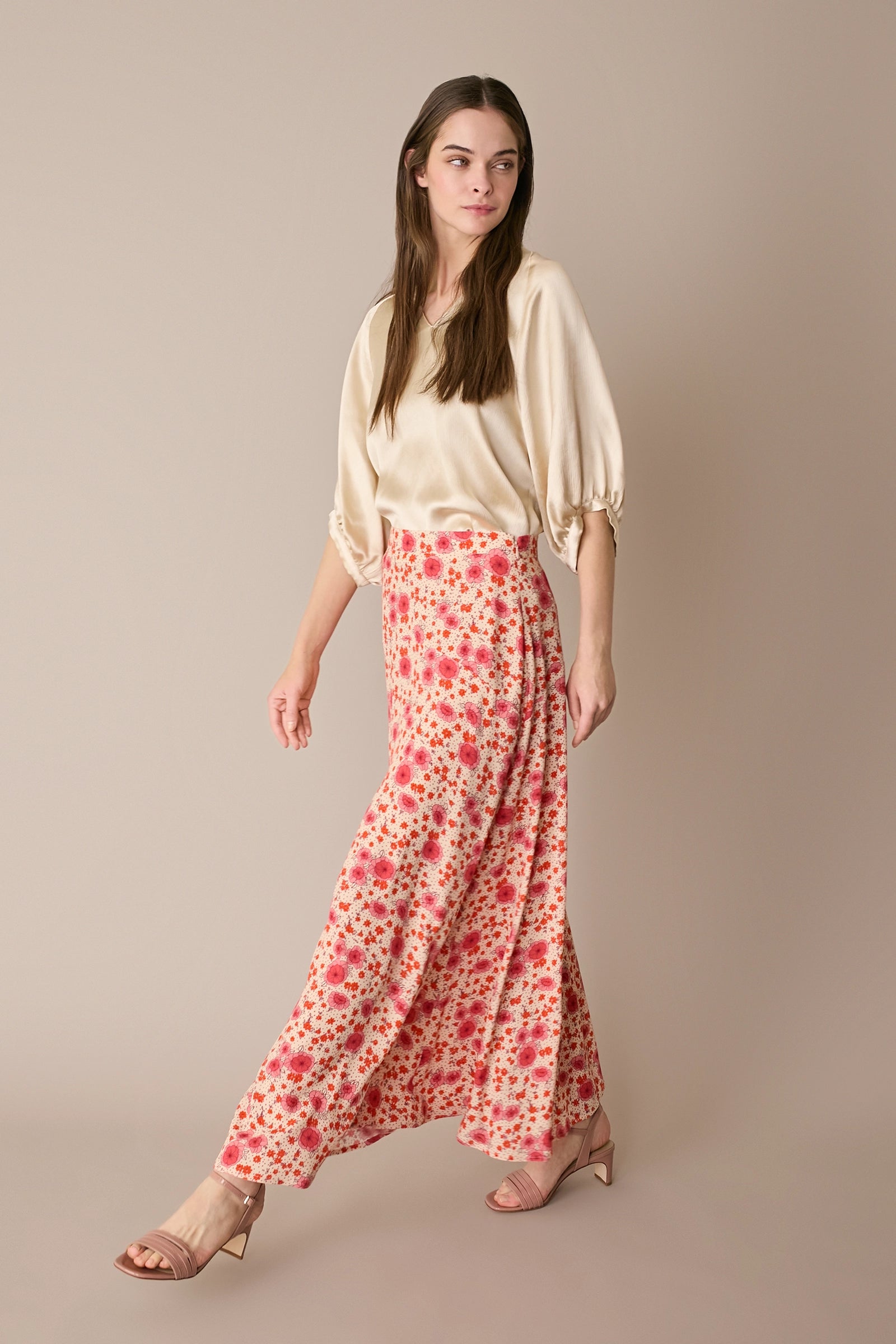 Per questa gonna abbiamo scelto una stampa d’ispirazione ’70s e un modello che la rende perfetta sia per le cerimonie sia per le vacanze. Caratterizzata da una baschina aderente che si apre in una gonna fluida, può essere abbinata a un top in seta per un evento, ma anche a una T-shirt in cotone e a un paio di sandali per le giornate estive. Disponibile in fantasia floreale su base panna o rosa.