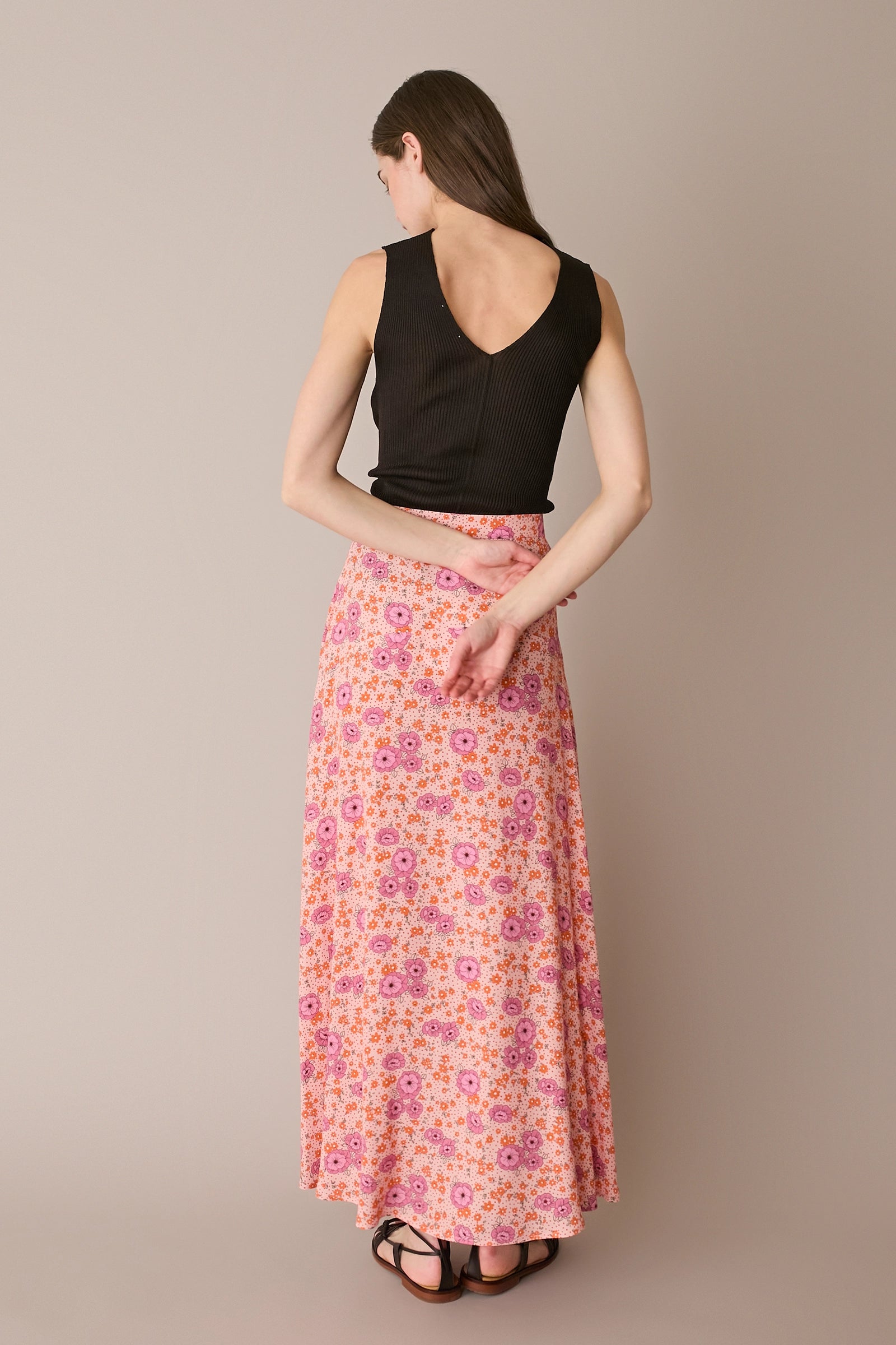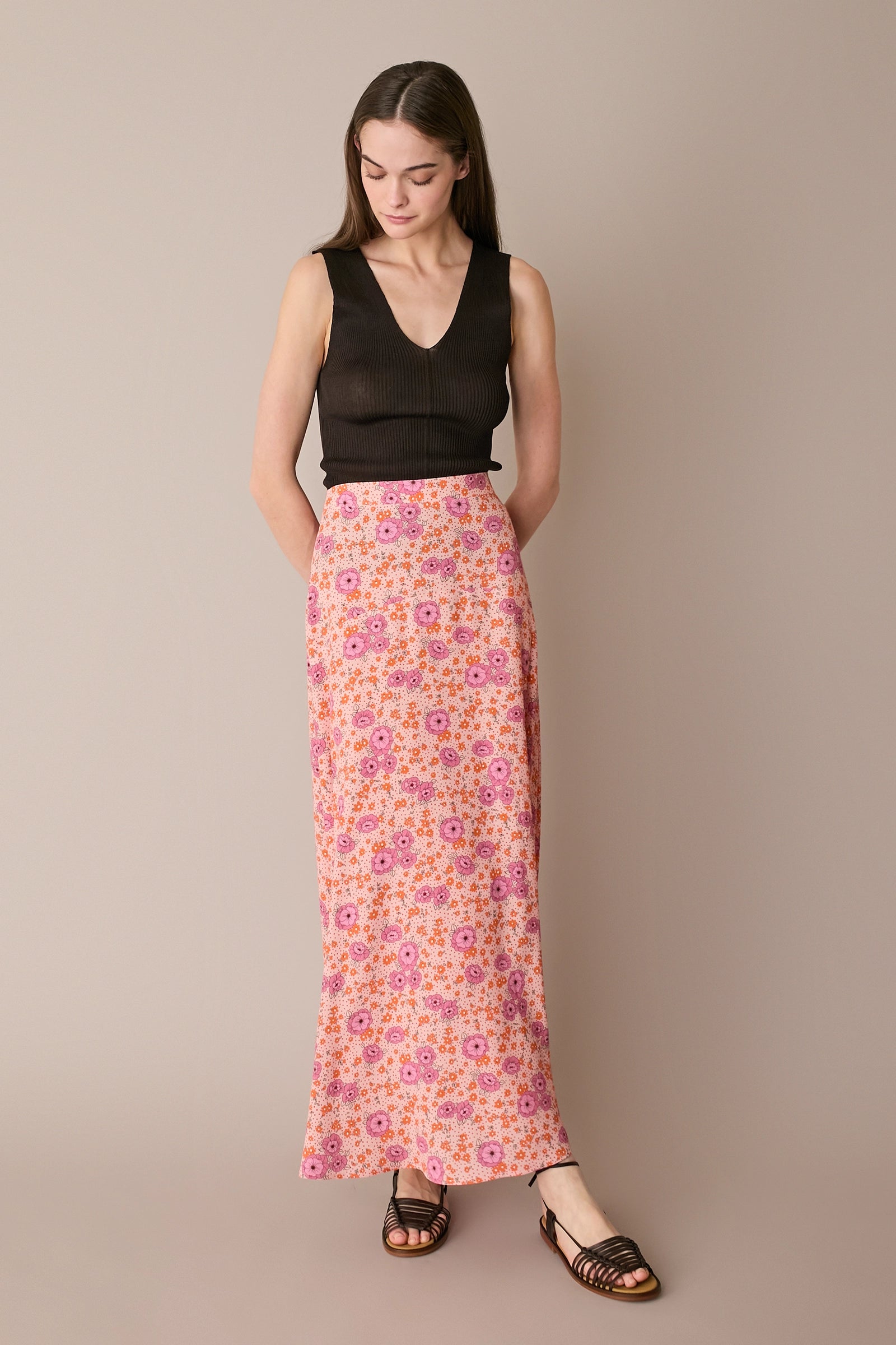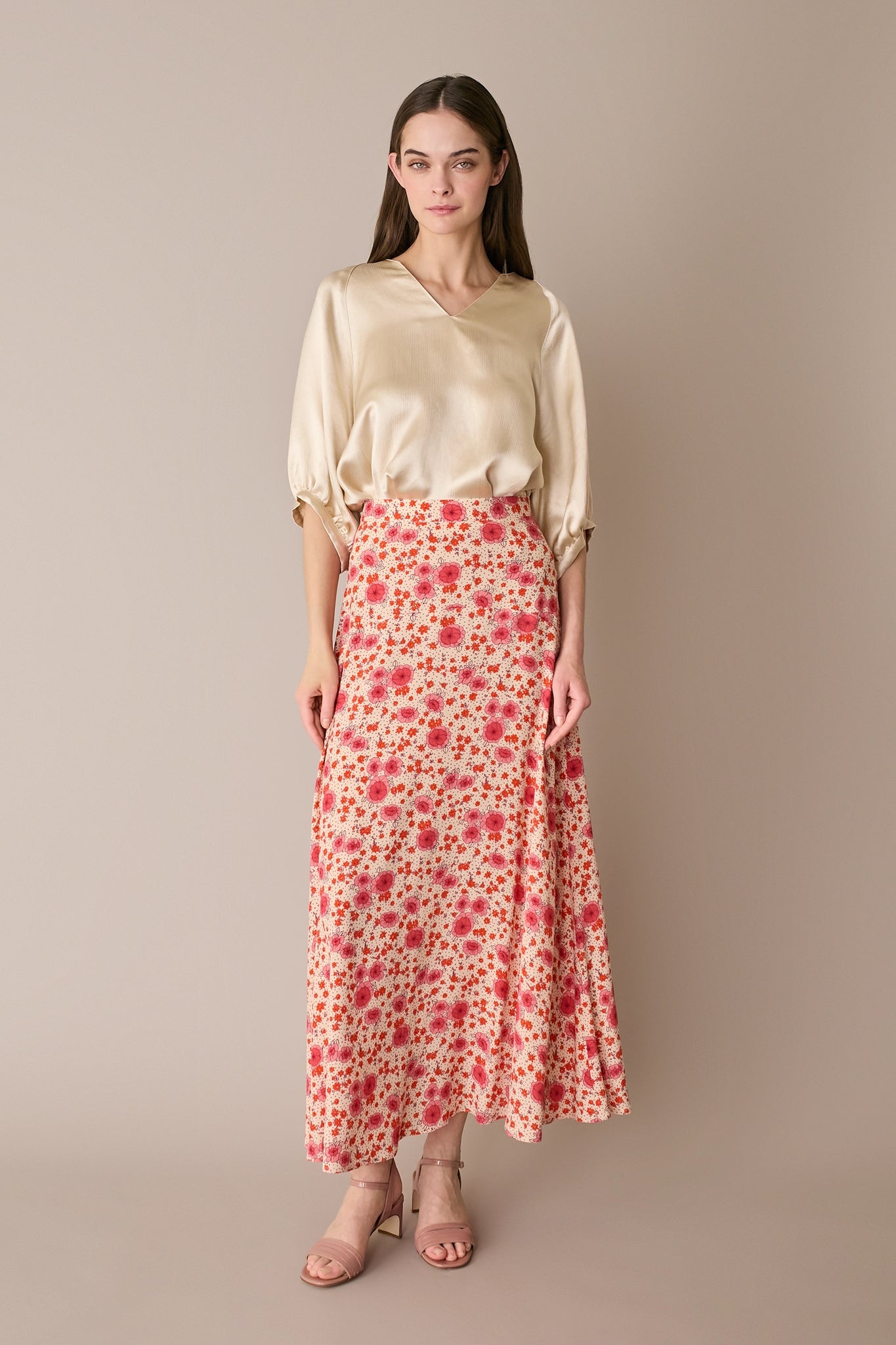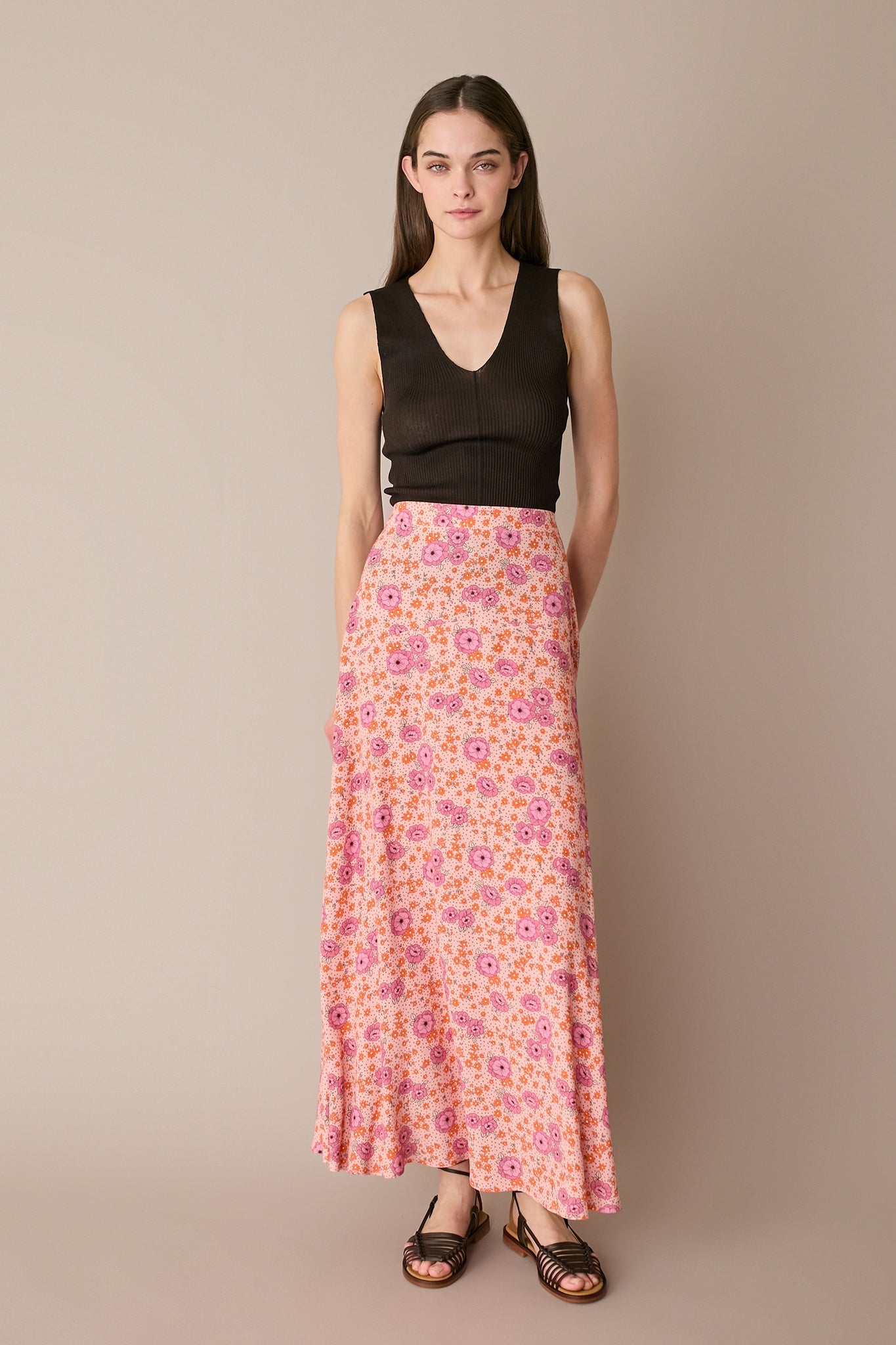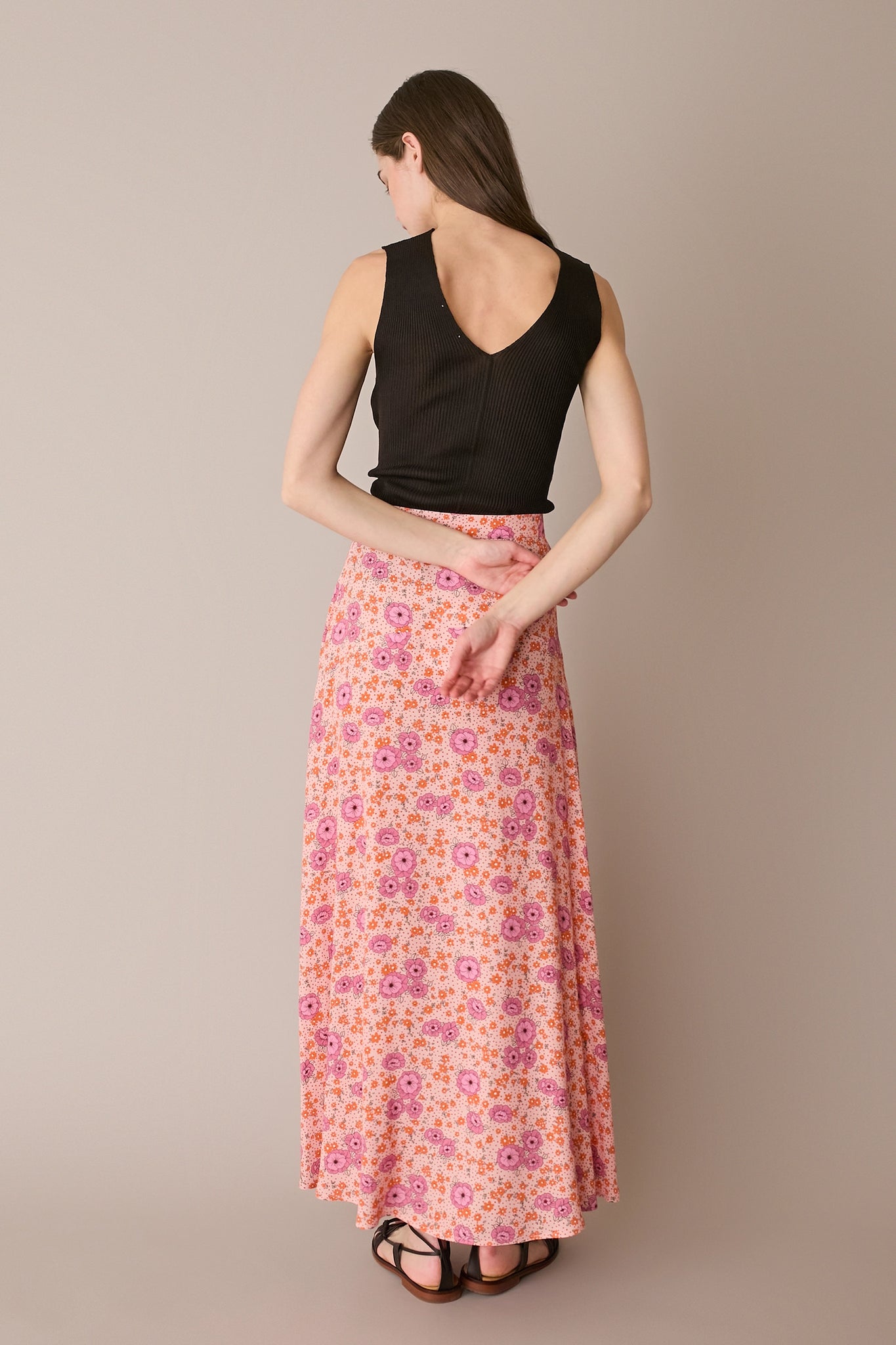 Per questa gonna abbiamo scelto una stampa d’ispirazione ’70s e un modello che la rende perfetta sia per le cerimonie sia per le vacanze. Caratterizzata da una baschina aderente che si apre in una gonna fluida, può essere abbinata a un top in seta per un evento, ma anche a una T-shirt in cotone e a un paio di sandali per le giornate estive. Disponibile in fantasia floreale su base panna o rosa.