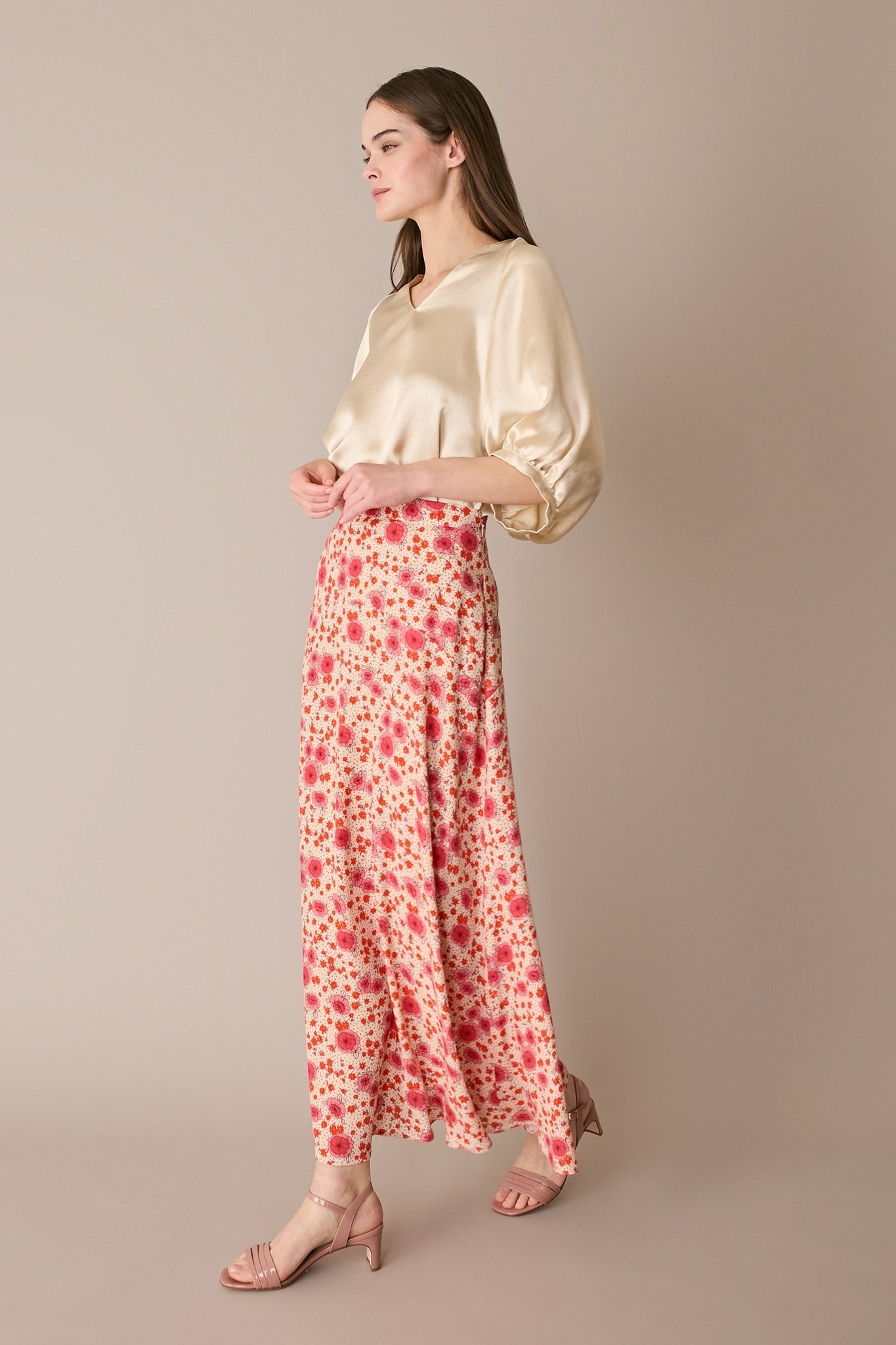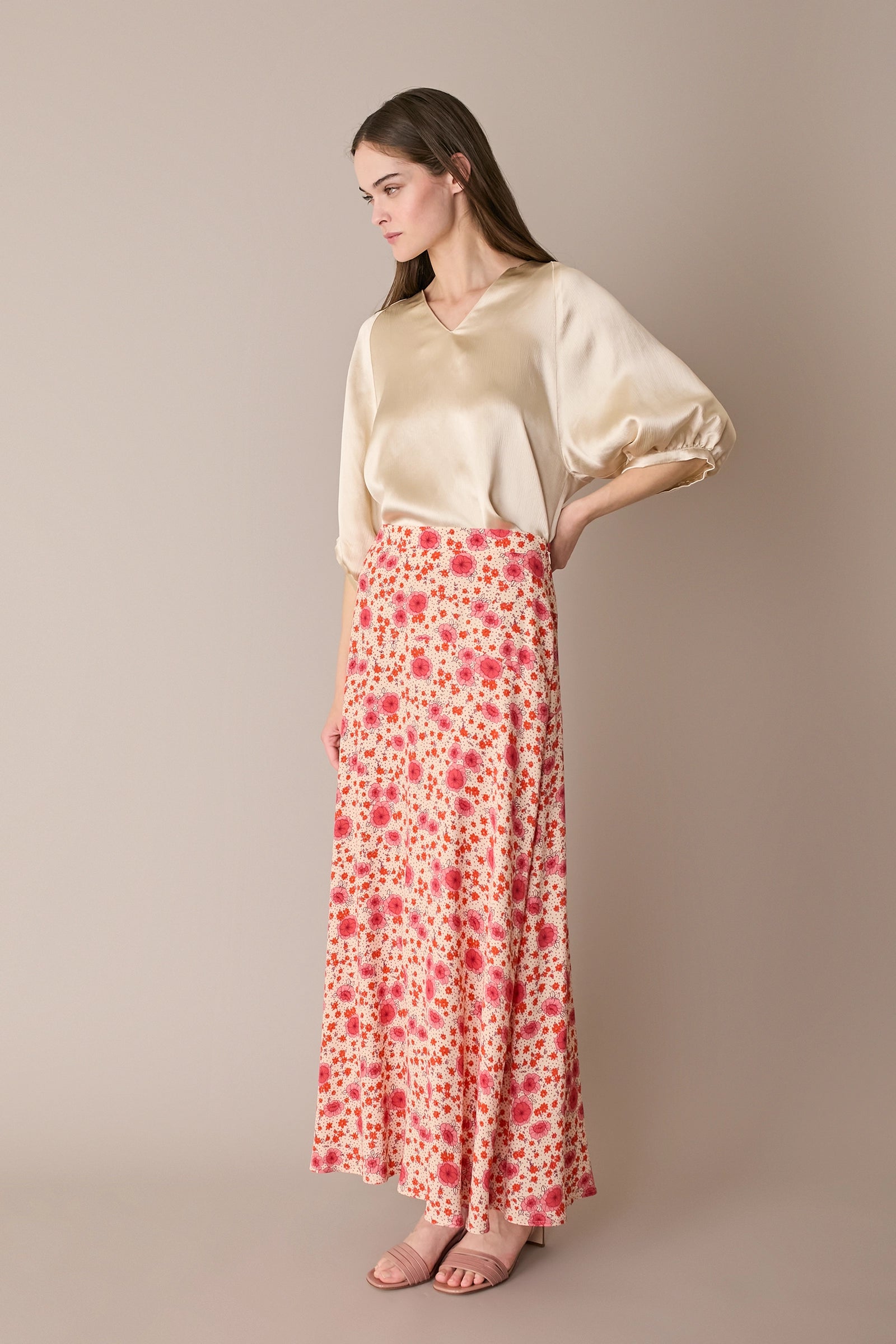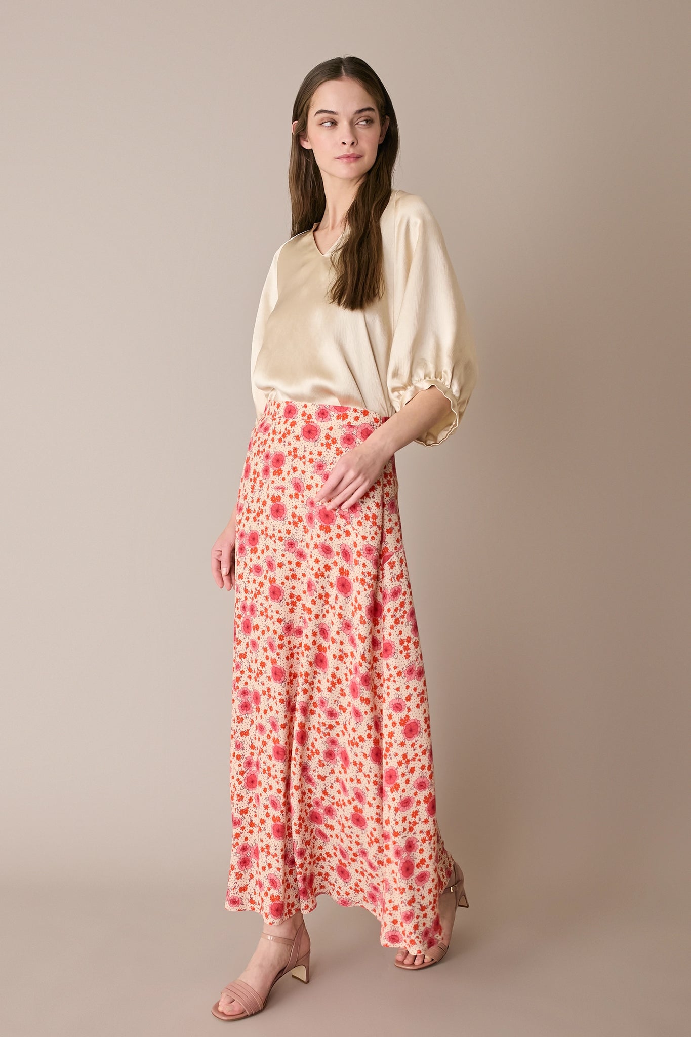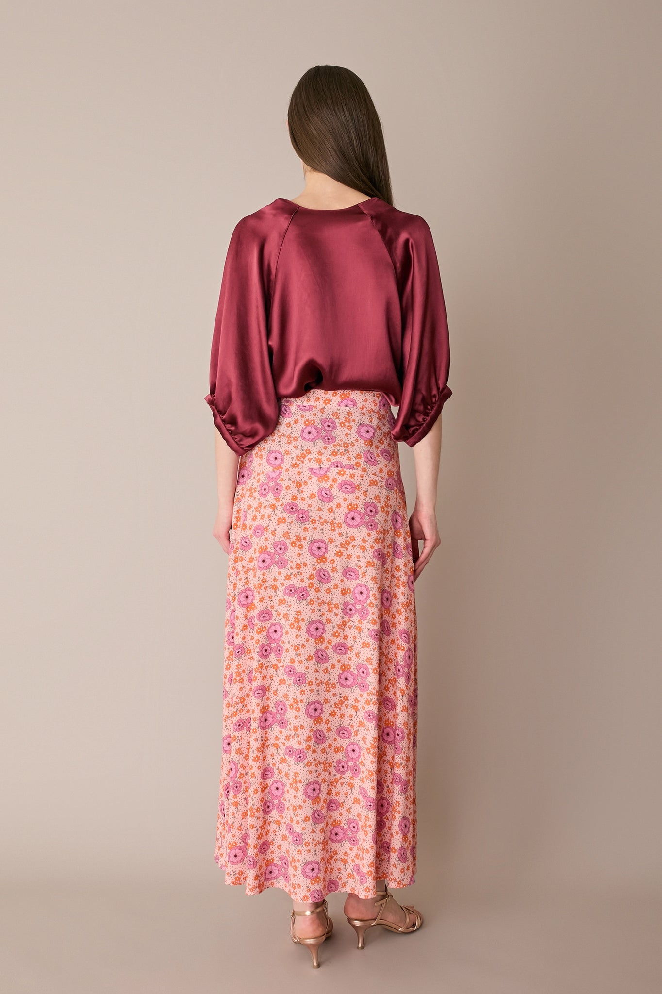 Per questa gonna abbiamo scelto una stampa d’ispirazione ’70s e un modello che la rende perfetta sia per le cerimonie sia per le vacanze. Caratterizzata da una baschina aderente che si apre in una gonna fluida, può essere abbinata a un top in seta per un evento, ma anche a una T-shirt in cotone e a un paio di sandali per le giornate estive. Disponibile in fantasia floreale su base panna o rosa.