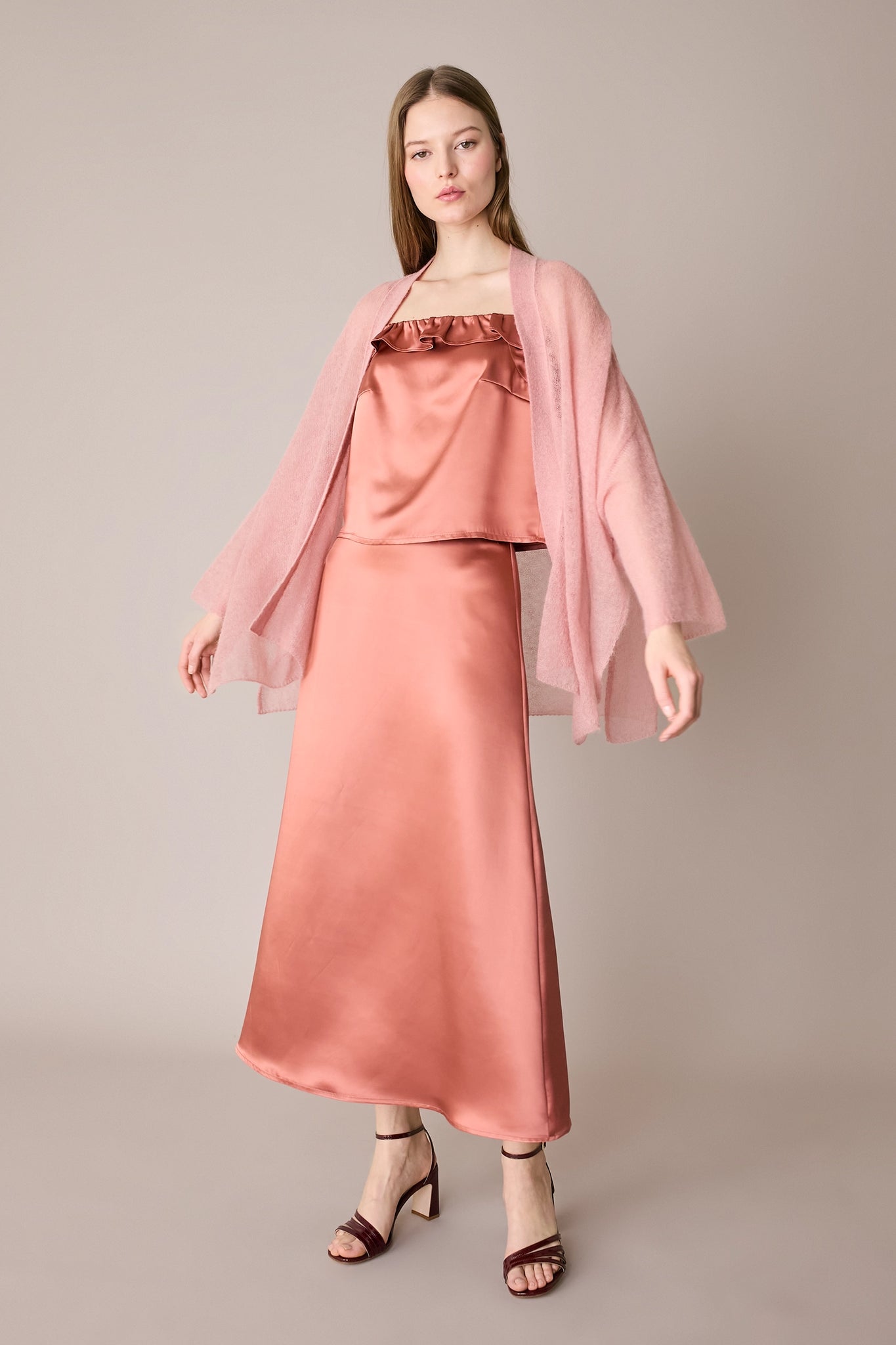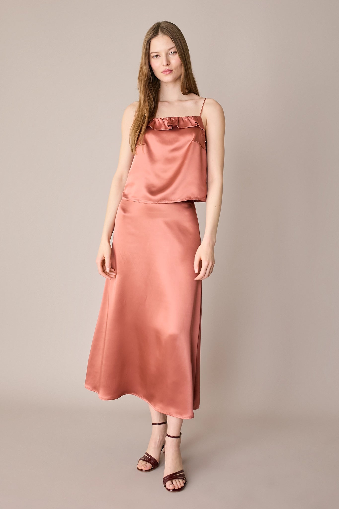 Questa gonna in raso è il capo perfetto per tutte le stagioni – e per tutte le occasioni. Indossala adesso con una camicia in cotone e un paio di mocassini, in vacanza con una T-shirt, ma anche in autunno con un maglioncino oversize e un paio di stivali. Hai un matrimonio o una cerimonia in programma? Puoi abbinarla al top realizzato nello stesso tessuto per creare un completo elegante.