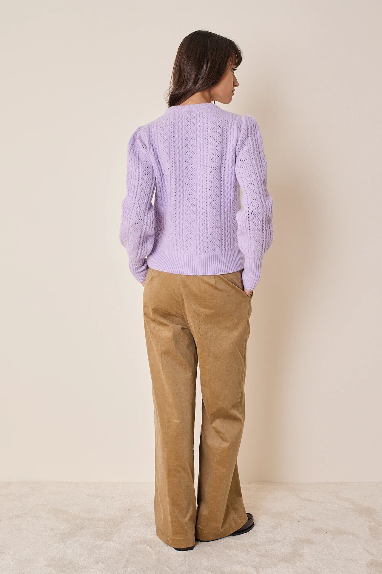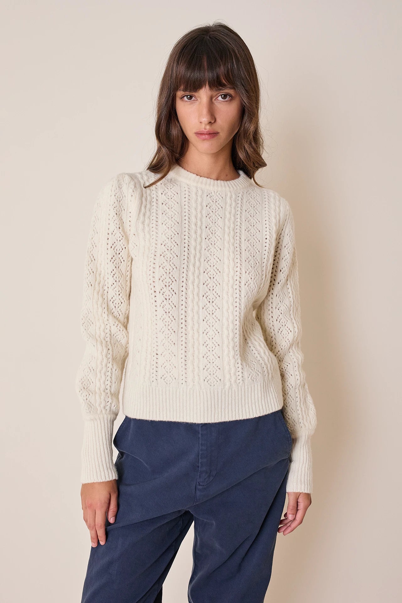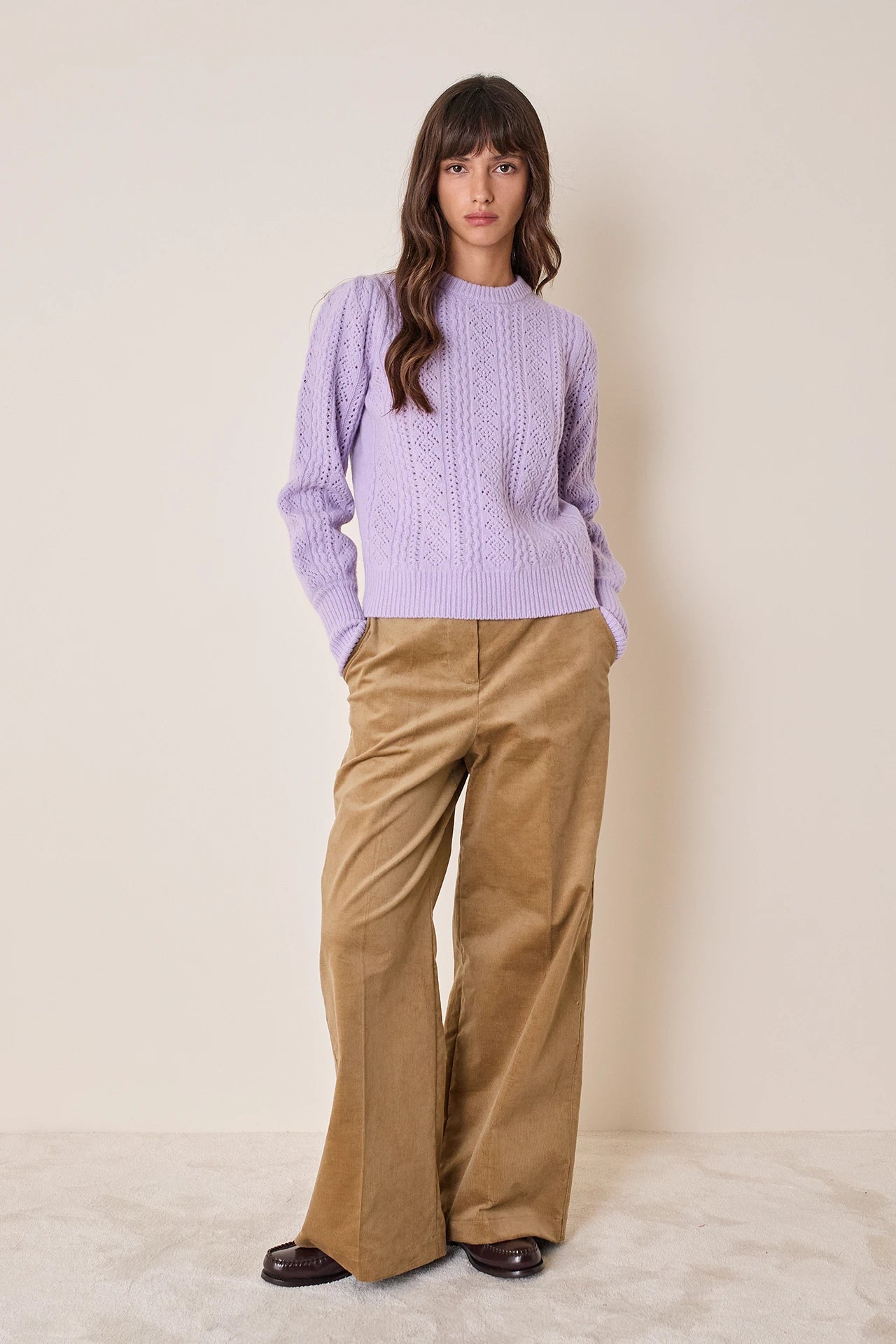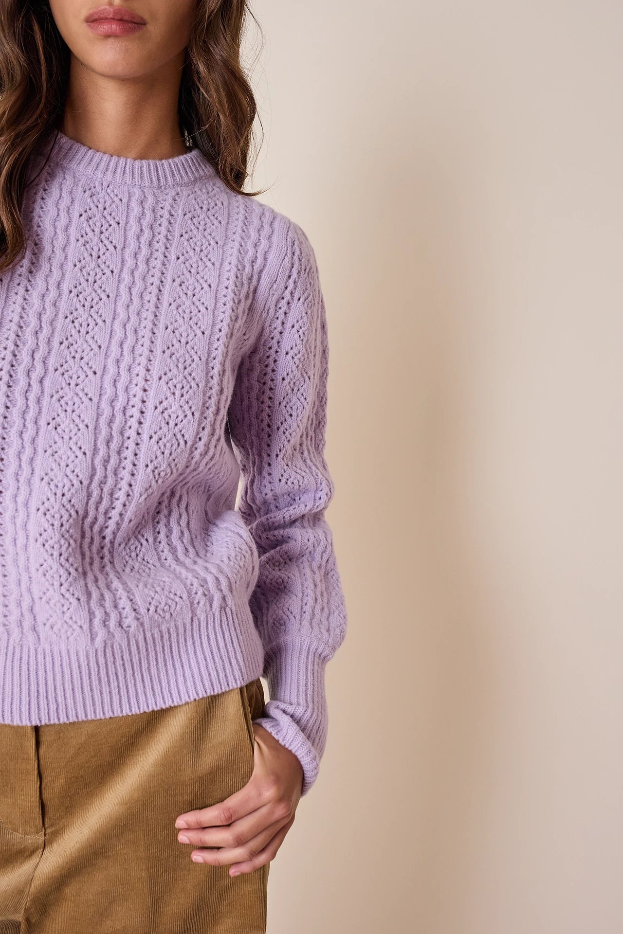 Questa maglia girocollo alterna motivi in rilievo e traforati, per un effetto elegante e leggero. Disponibile in panna, bordeaux, lilla o verde.