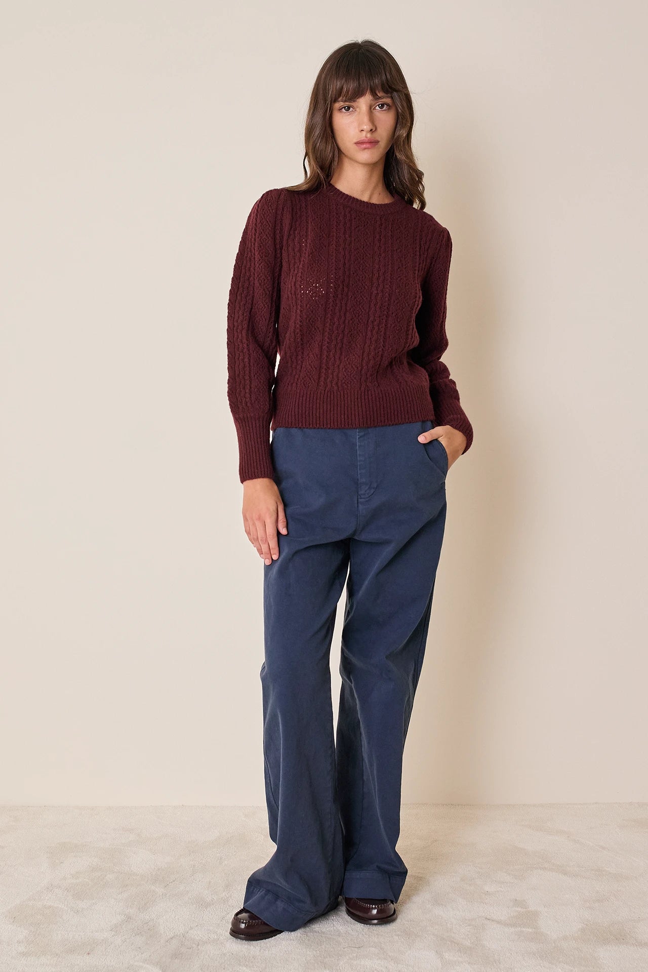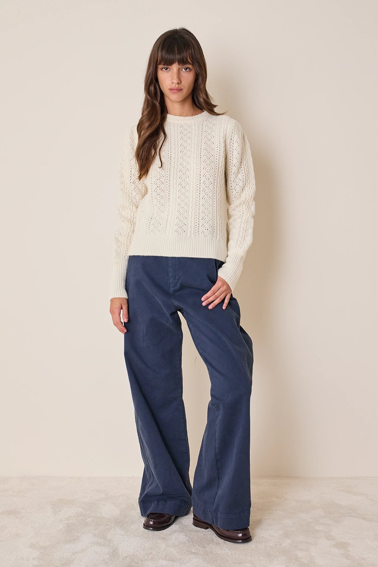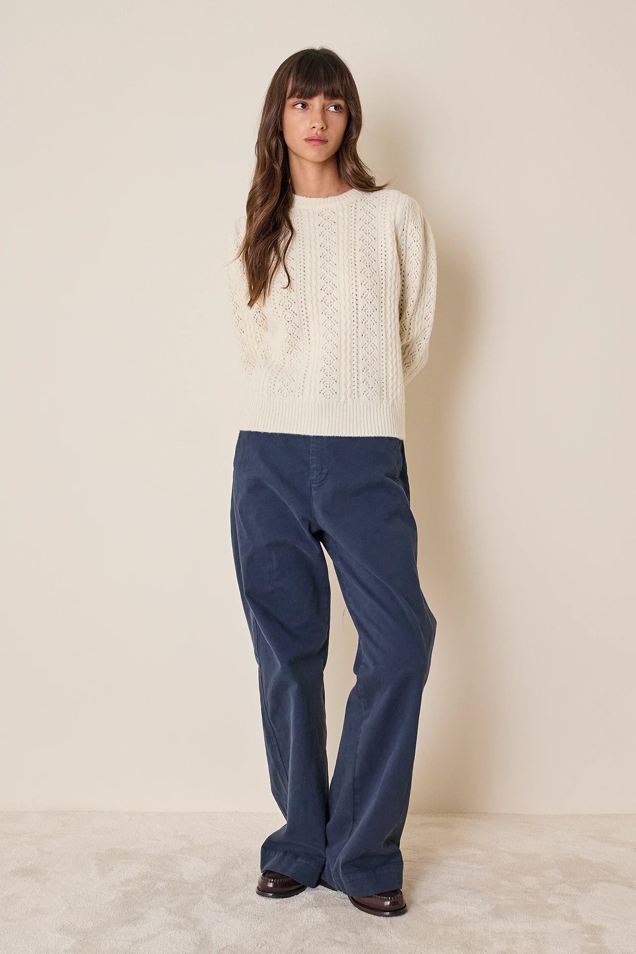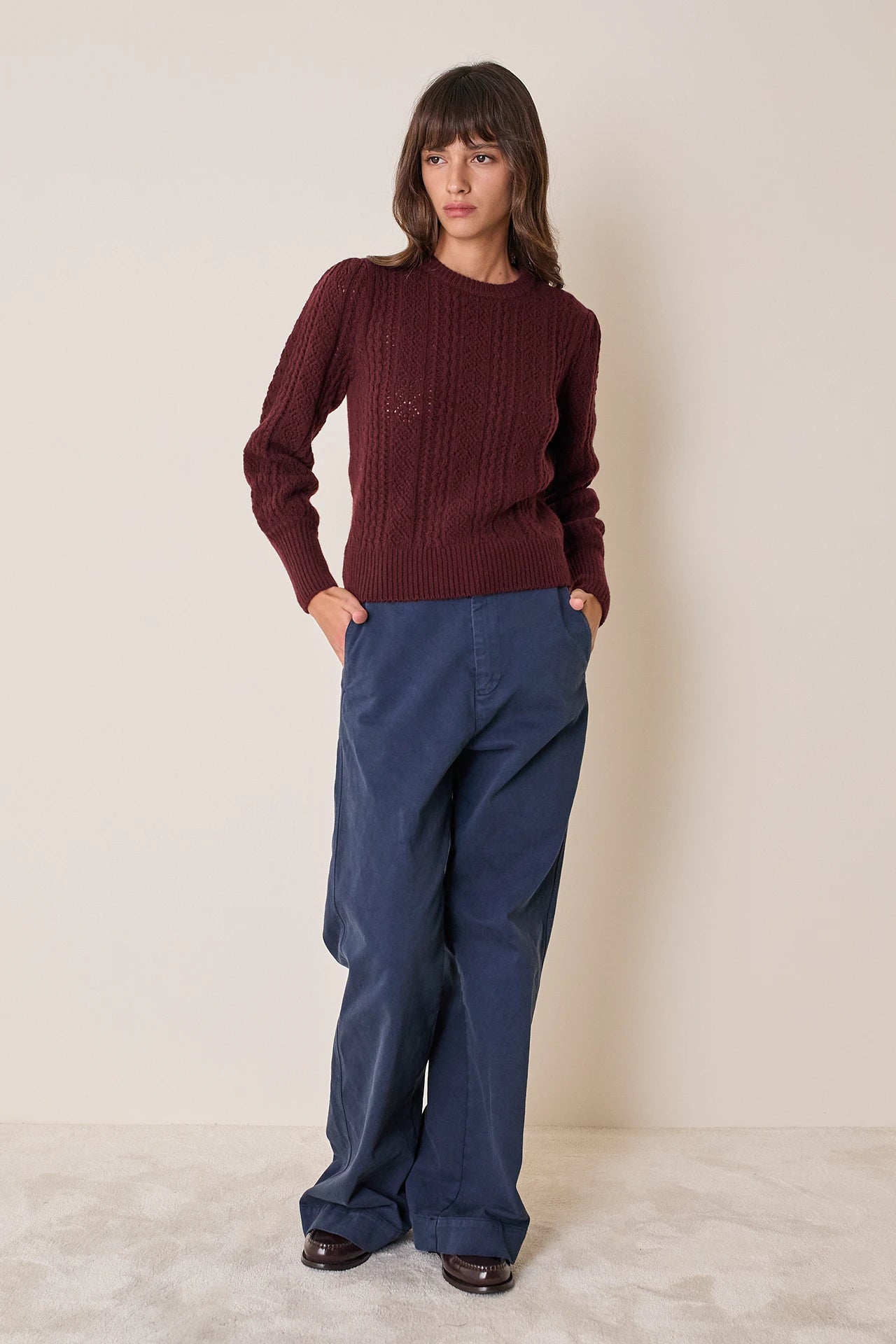 Questa maglia girocollo alterna motivi in rilievo e traforati, per un effetto elegante e leggero. Disponibile in panna, bordeaux, lilla o verde.