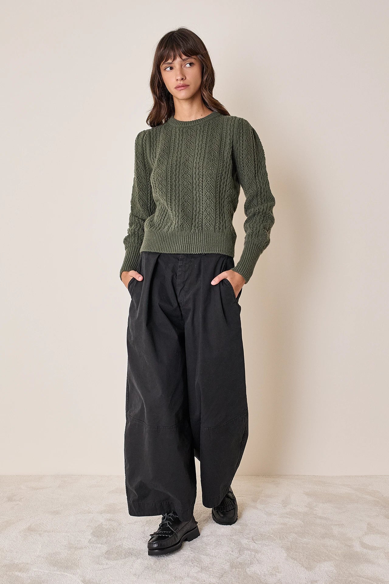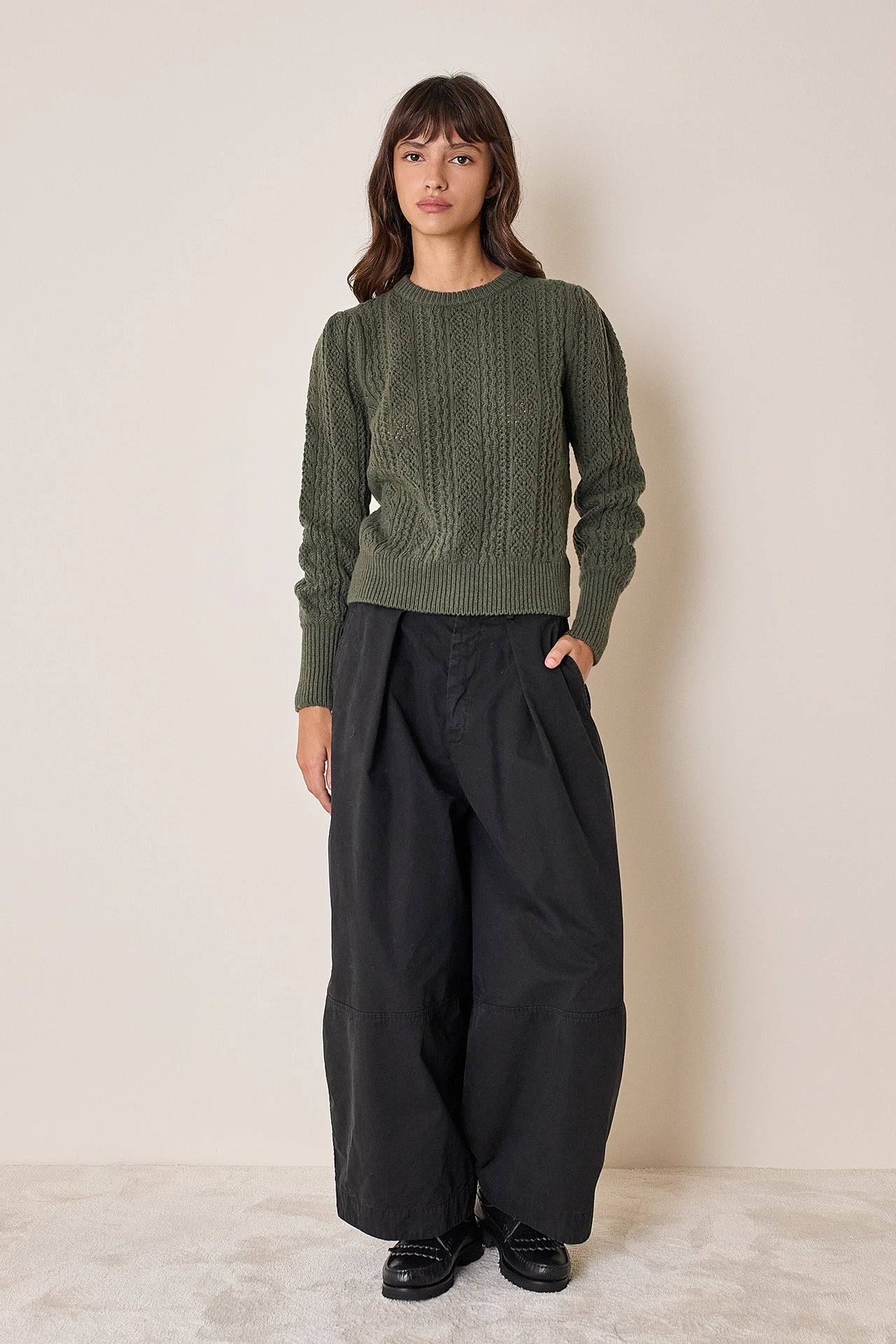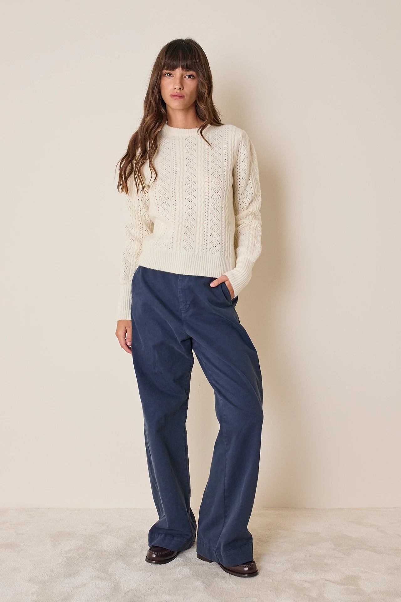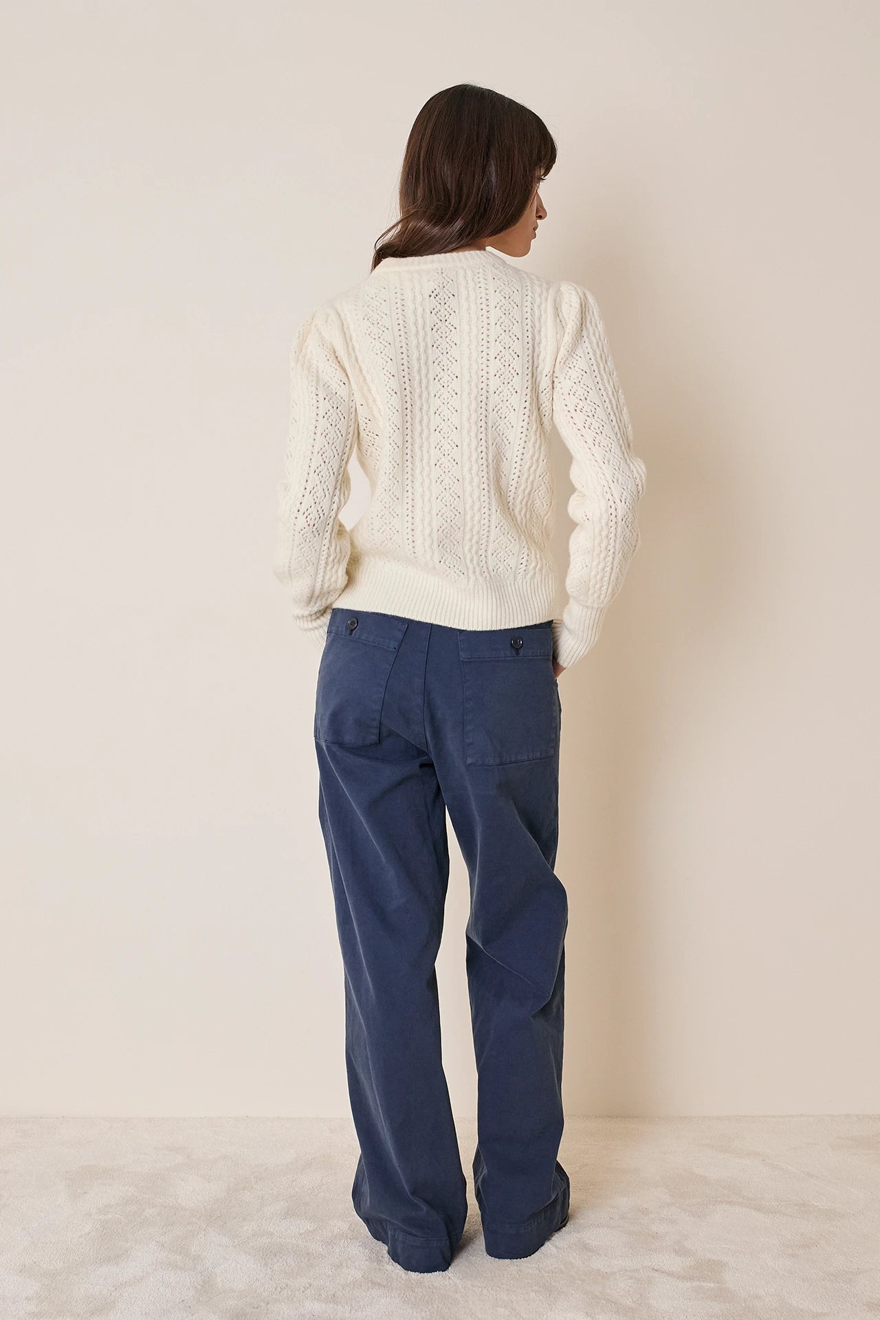 Questa maglia girocollo alterna motivi in rilievo e traforati, per un effetto elegante e leggero. Disponibile in panna, bordeaux, lilla o verde.