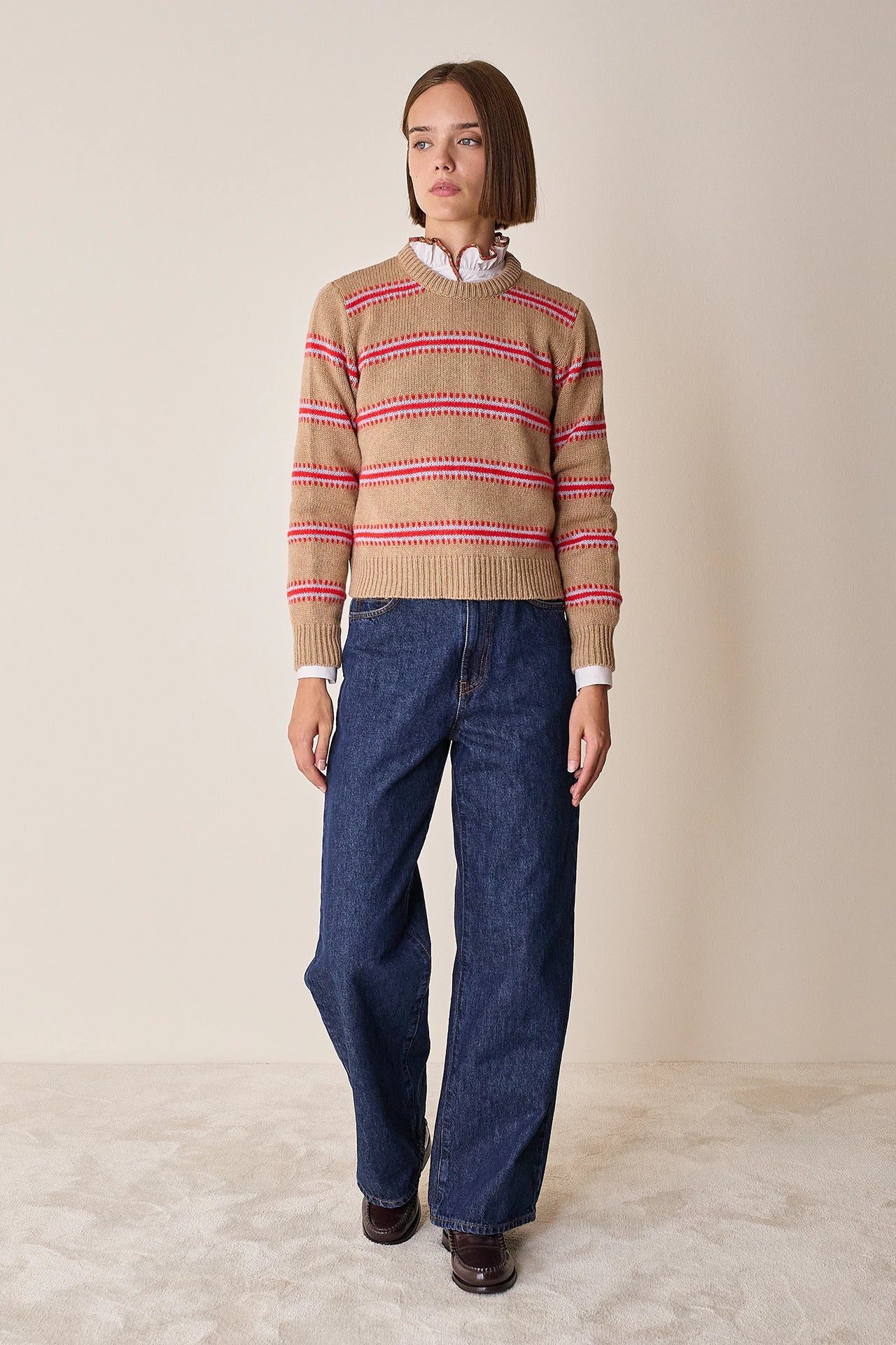 Questa maglia girocollo in blend di alpaca è caratterizzata da un motivo a righe jacquard. Collo, polsini e orlo sono rifiniti con una lavorazione a coste per garantire una migliore tenuta della forma nel tempo. Perfetta da abbinare a pantaloni sartoriali o jeans, a seconda dell’occasione, è disponibile in biscotto con righe blu, nocciola con righe rosse o panna con righe rosa.