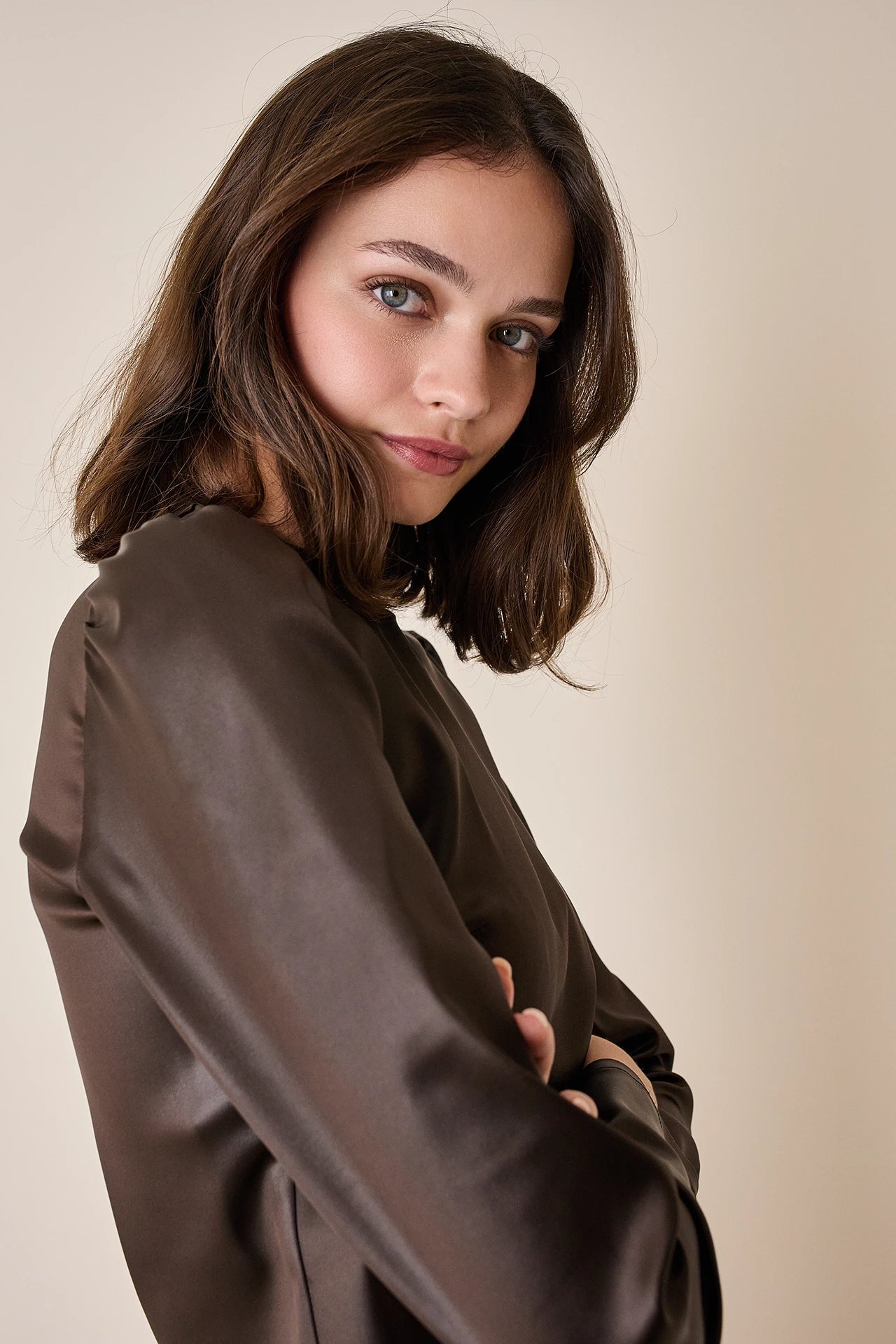 Per questo top abbiamo scelto un tessuto luminoso effetto pelle. Perfetto da solo o come sottogiacca, è disponibile in cioccolato.