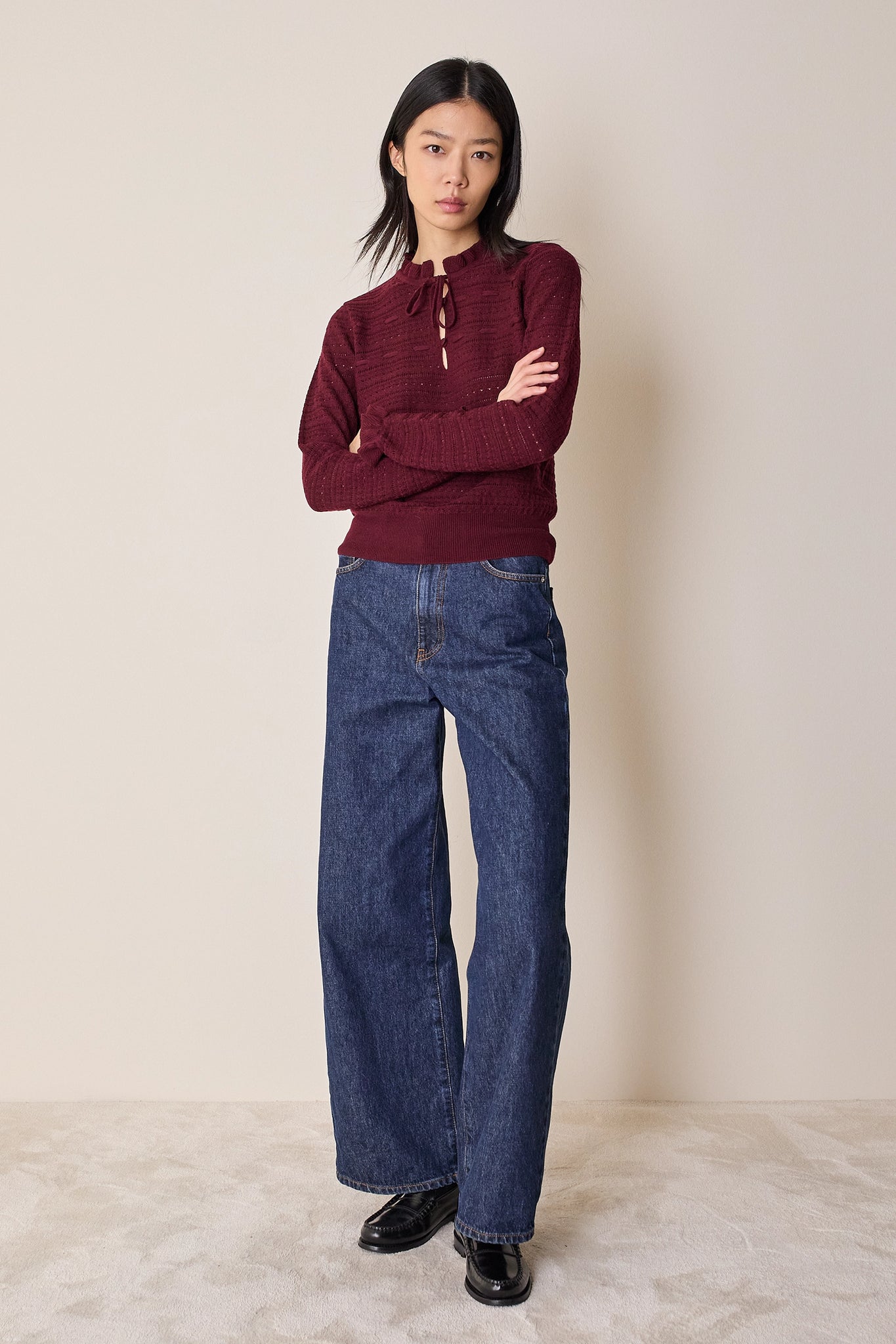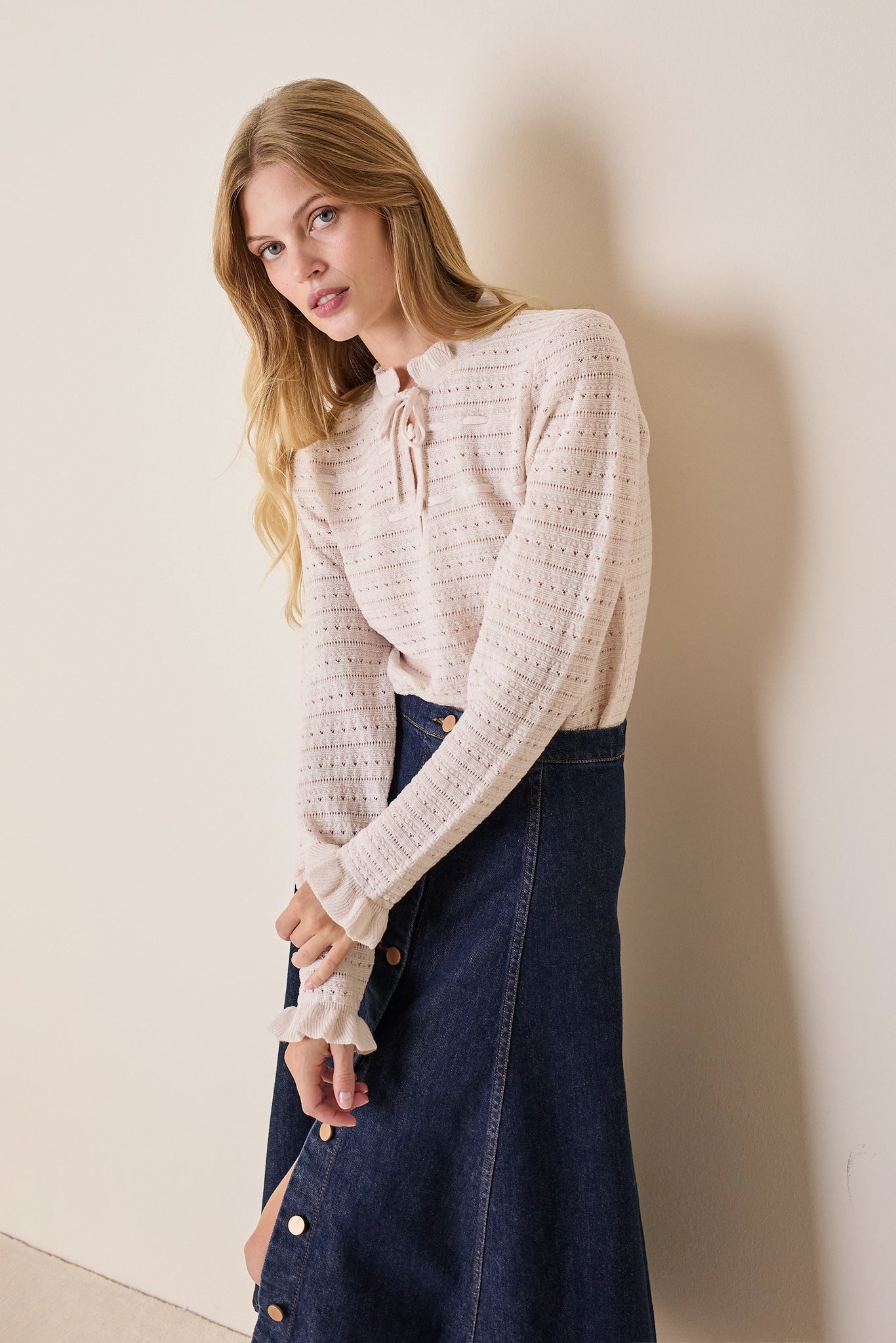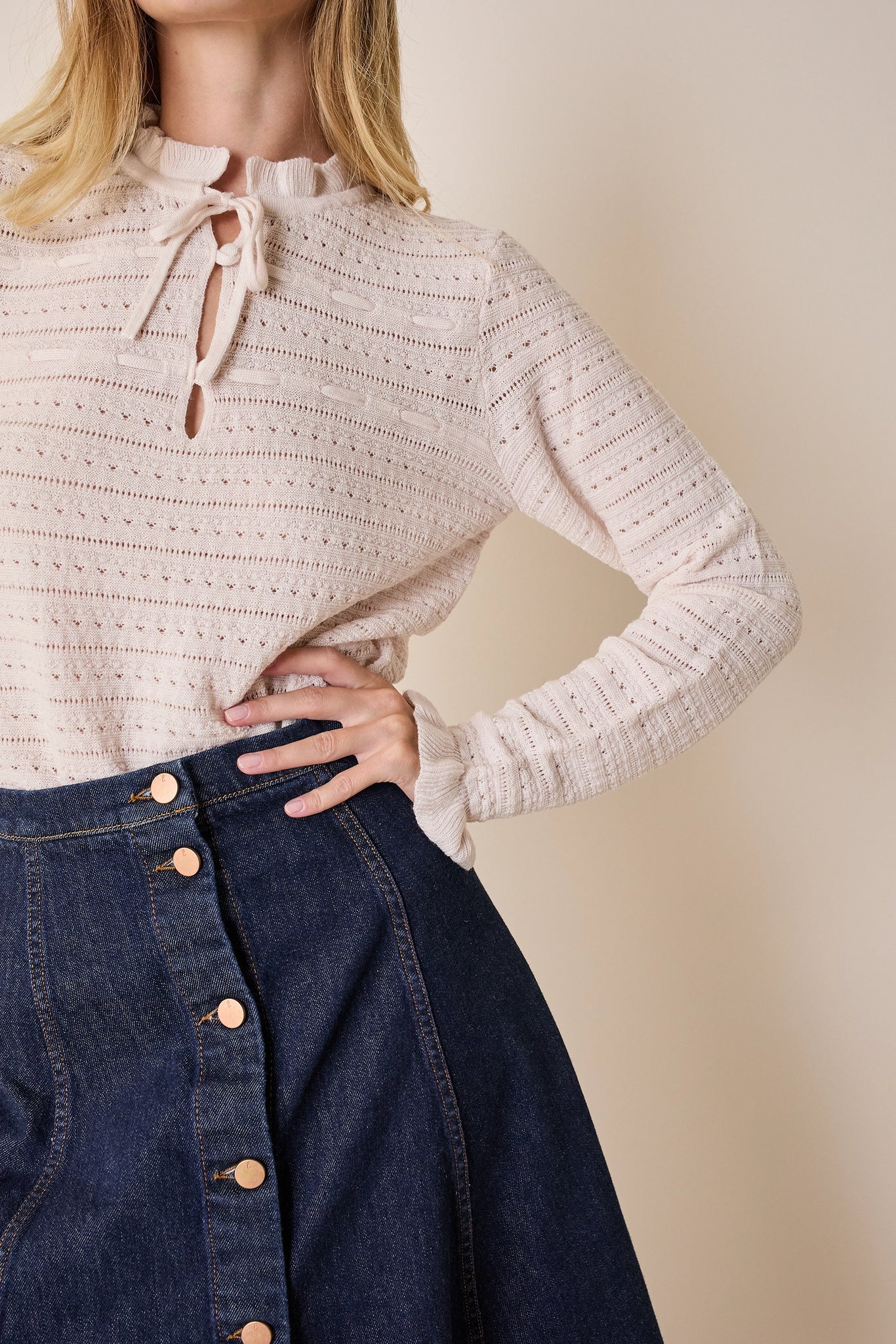 L'ispirazione per questa maglia traforata viene dagli anni '70. Caratterizzata dai piccoli volant delle maniche e del colletto, da un laccetto che può essere annodato a fiocco o lasciato aperto e da un motivo traforato geometrico, è disponibile in azzurro, avorio o oliva.