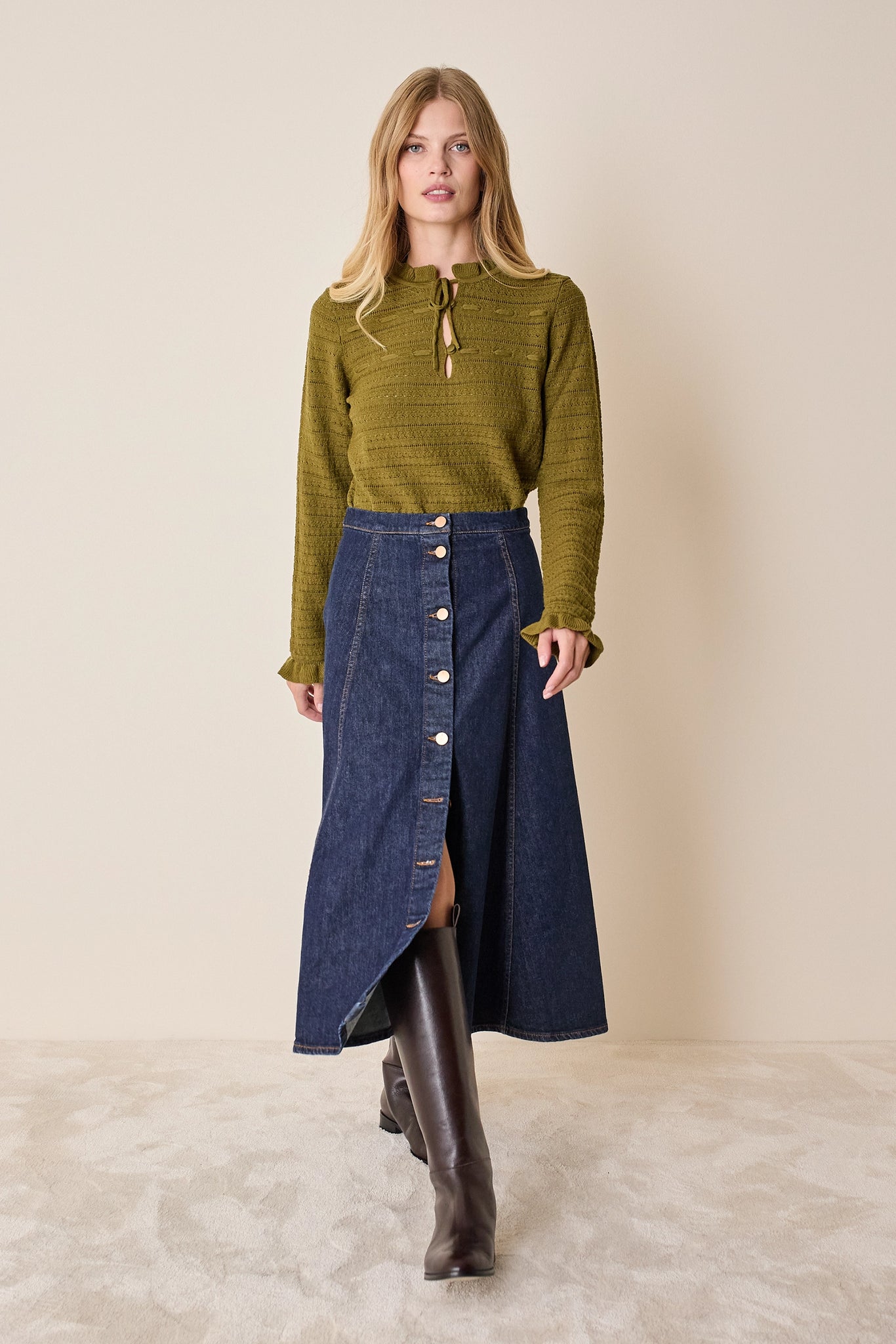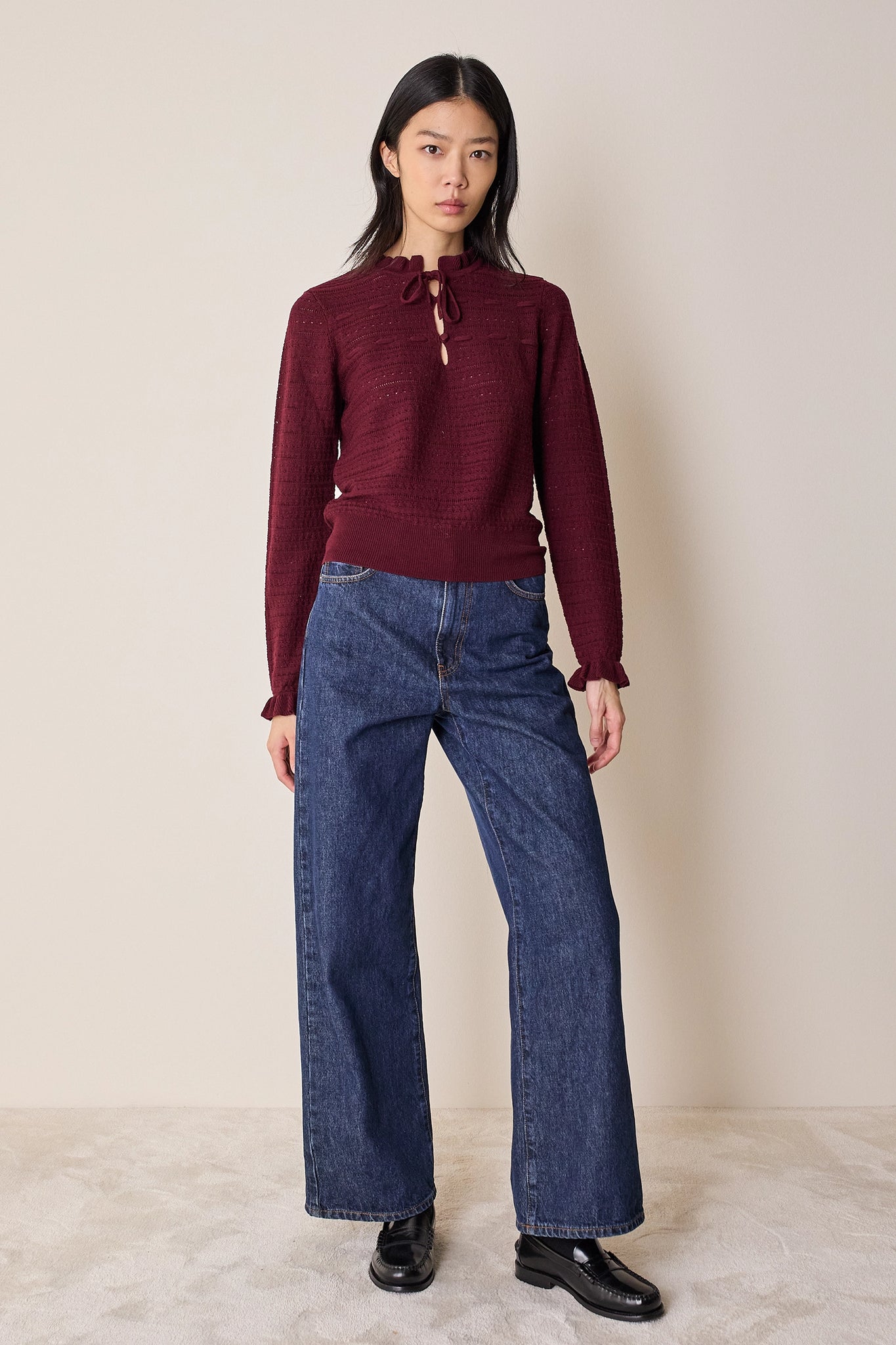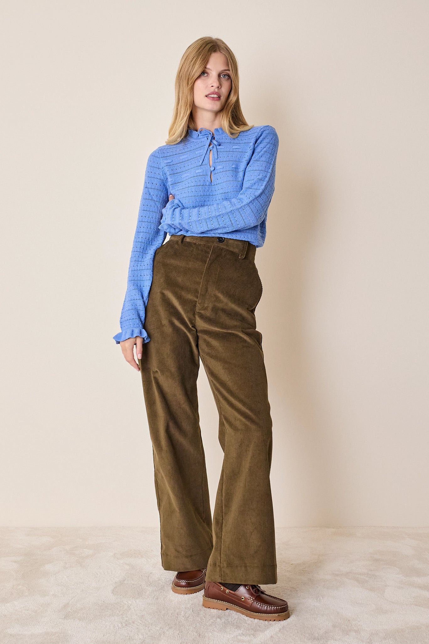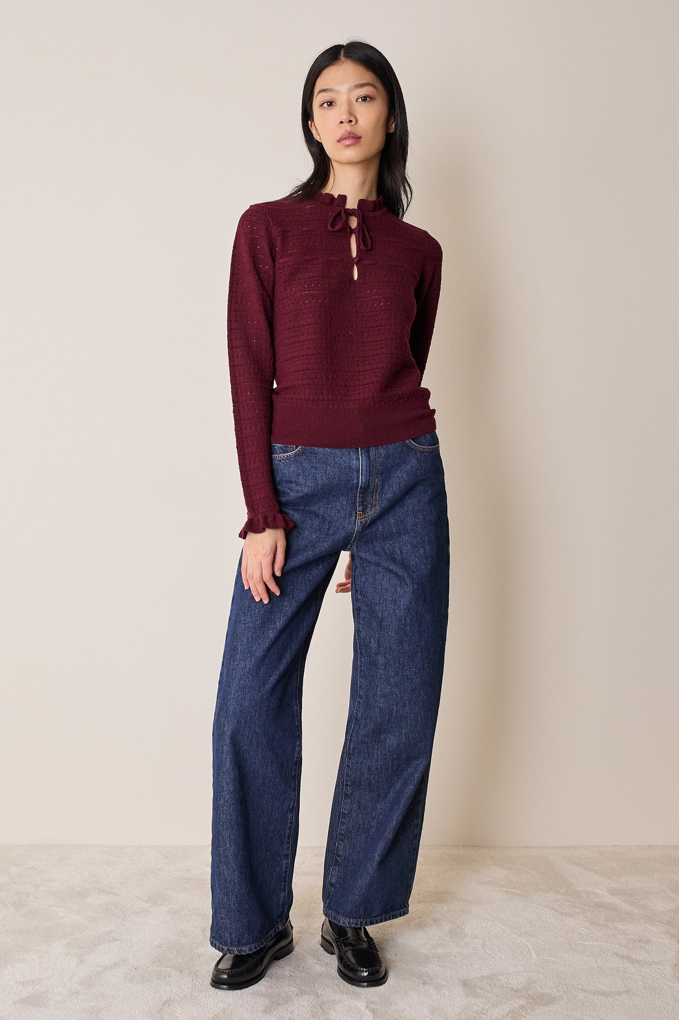 L'ispirazione per questa maglia traforata viene dagli anni '70. Caratterizzata dai piccoli volant delle maniche e del colletto, da un laccetto che può essere annodato a fiocco o lasciato aperto e da un motivo traforato geometrico, è disponibile in azzurro, avorio o oliva.