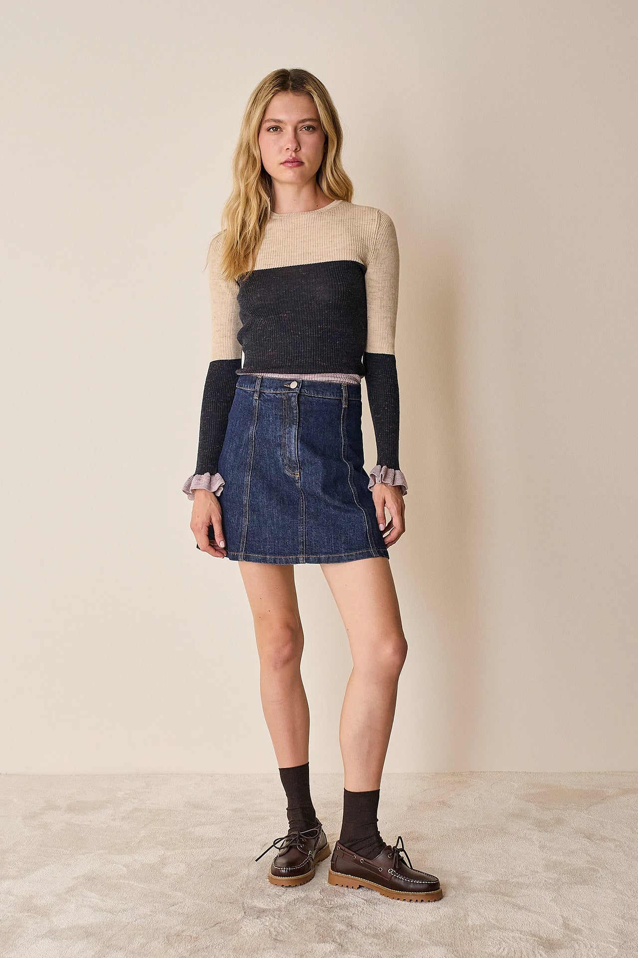 Questa gonna a pannelli in denim è il capo perfetto per tutte le stagioni. Puoi indossarla ora, abbinata a una camicia in cotone e a un paio di mocassini, in estate con sandali e t-shirt, ma anche quando fa più freddo, con un maglione oversize e calze in lana.