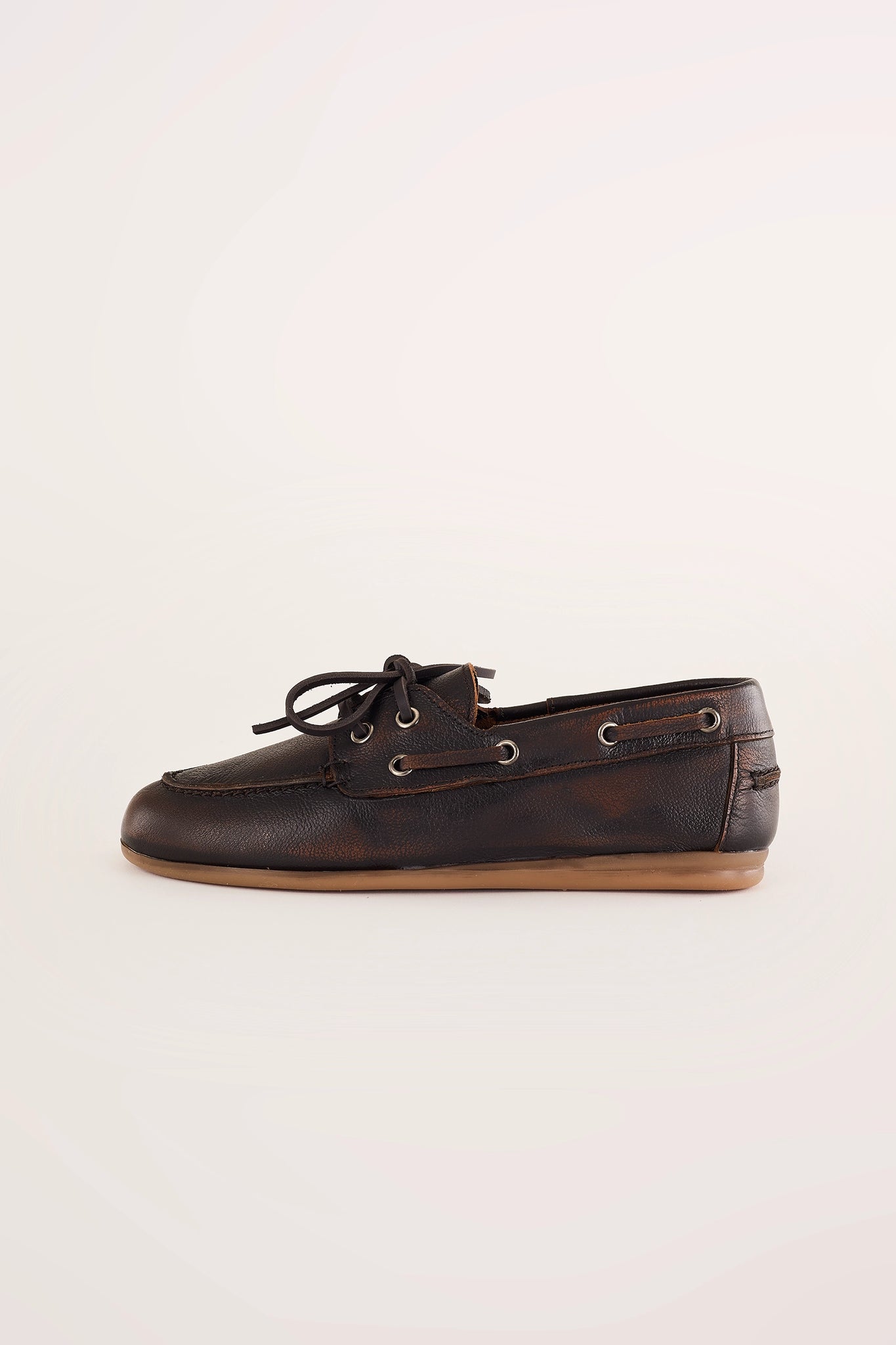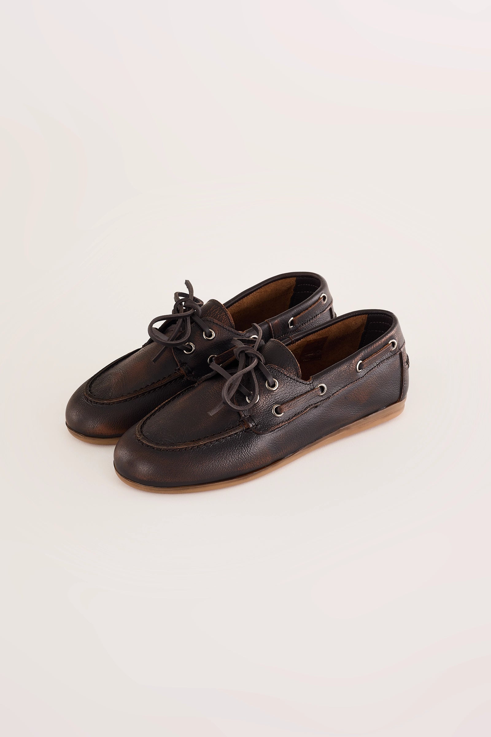Questi mocassini da barca uniscono lo stile college all’ispirazione vintage, grazie a una speciale lavorazione della pelle che ricorda le naturali scoloriture causate dal sole. La silhouette leggermente affusolata e la suola in gomma assicurano comfort e versatilità. Disponibili in morbida nappa marrone con lacci in pelle, oppure in pelle scamosciata color tabacco con lacci in corda.