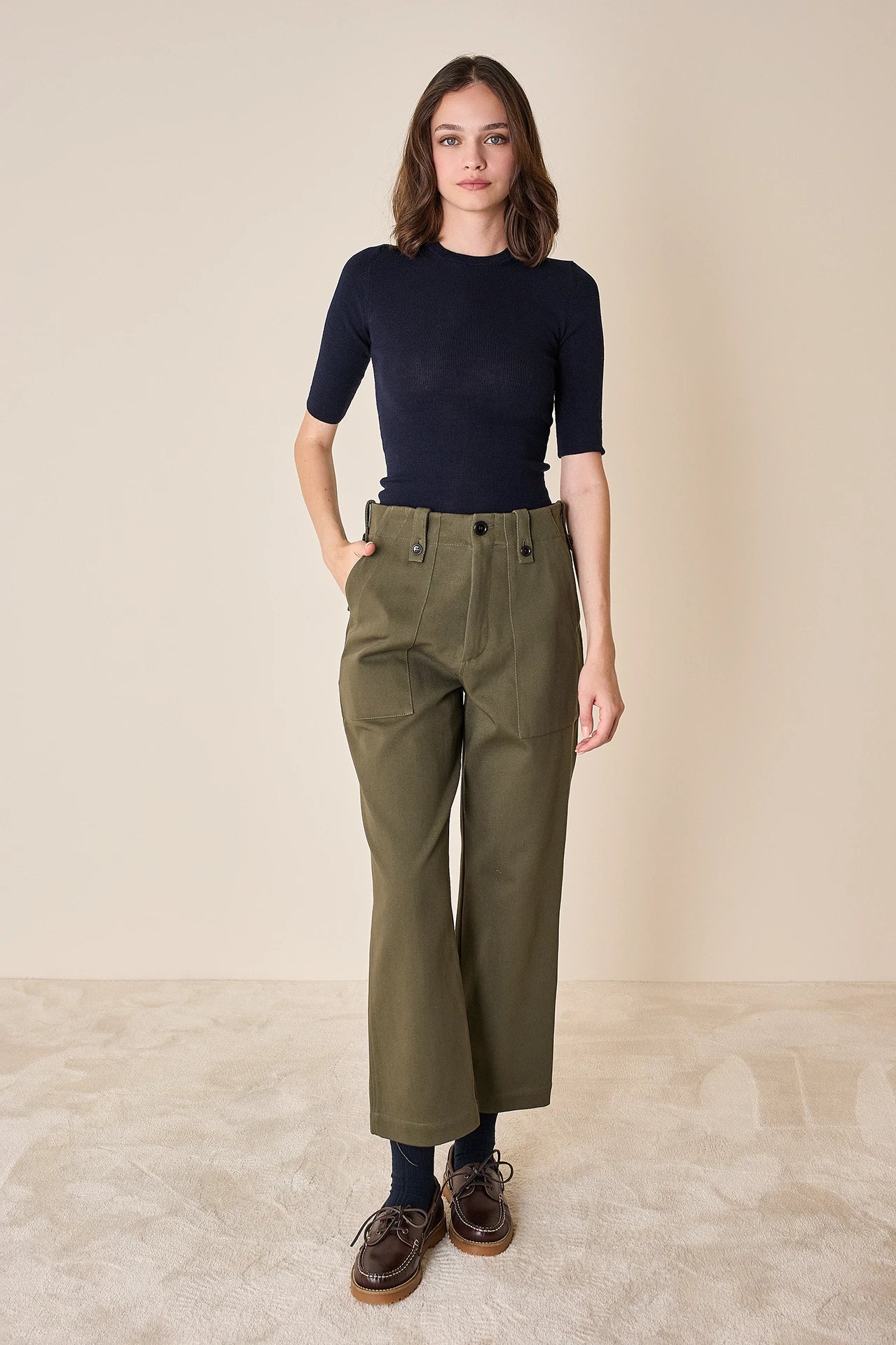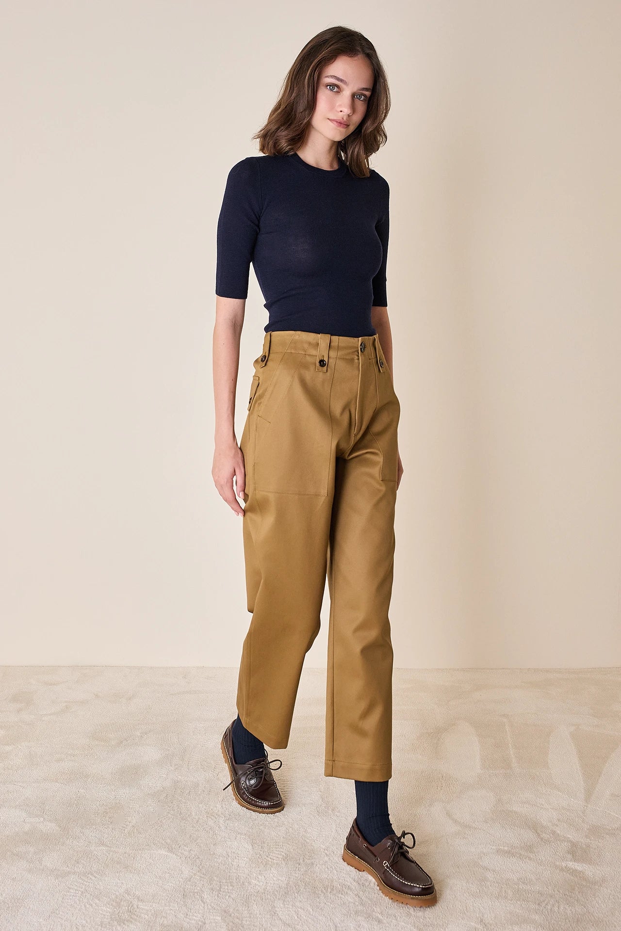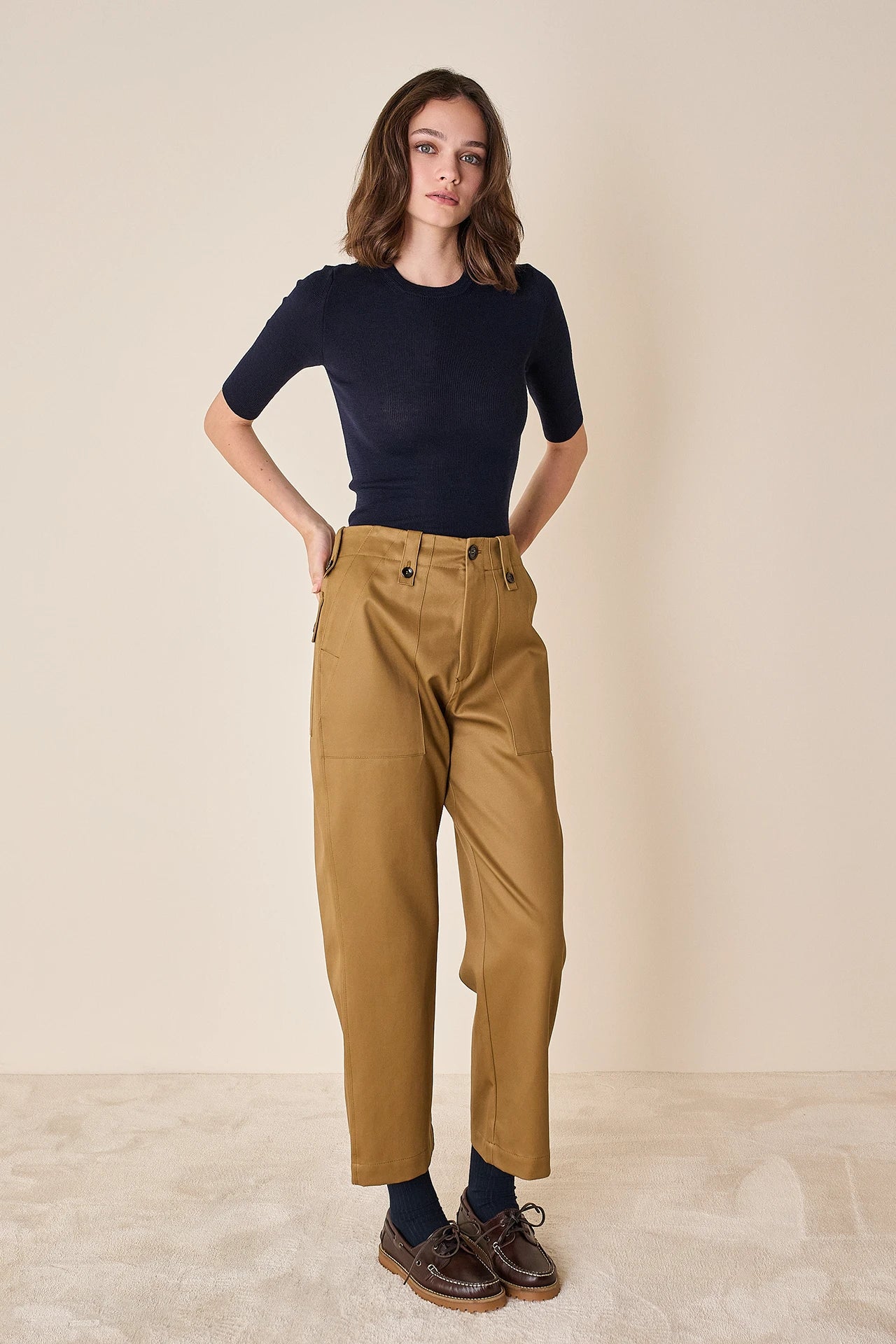 L'ispirazione per questi pantaloni viene da un modello originale militare che abbiamo trovato in un negozio second hand inglese. Da lì vengono gli alamari usati come passanti per la cintura, i tiranti regolabili che creano un effetto arricciato in vita e la tasca cargo posteriore. Realizzati in cotone resistente e strutturato, sono disponibili in biscotto o verde militare.