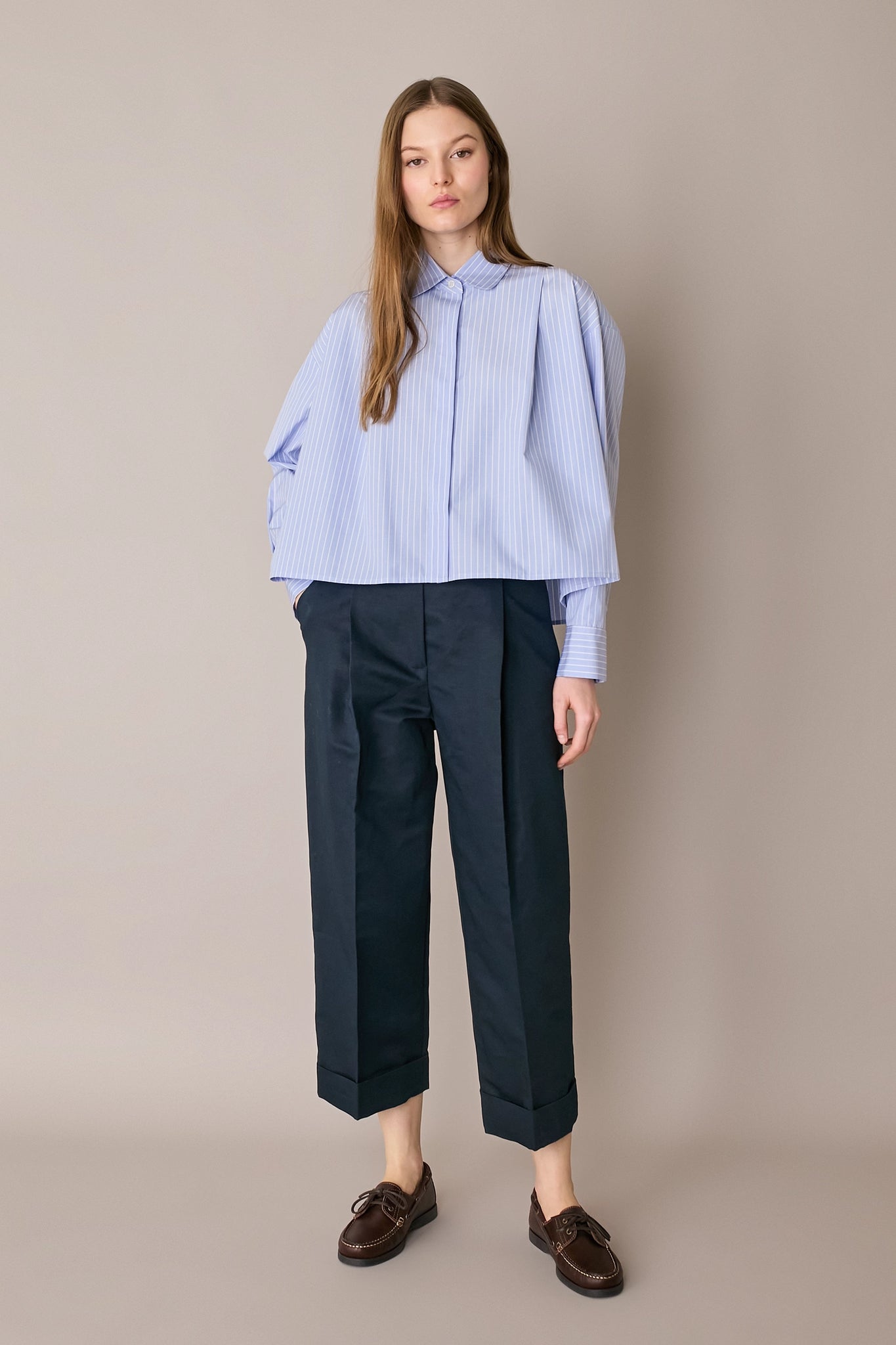 Questi pantaloni in cotone a gamba dritta sono perfetti per tutti i giorni. Il taglio dritto e la linea ampia li rendono ideali sia con i mocassini che con le ballerine. Disponibili in blu.