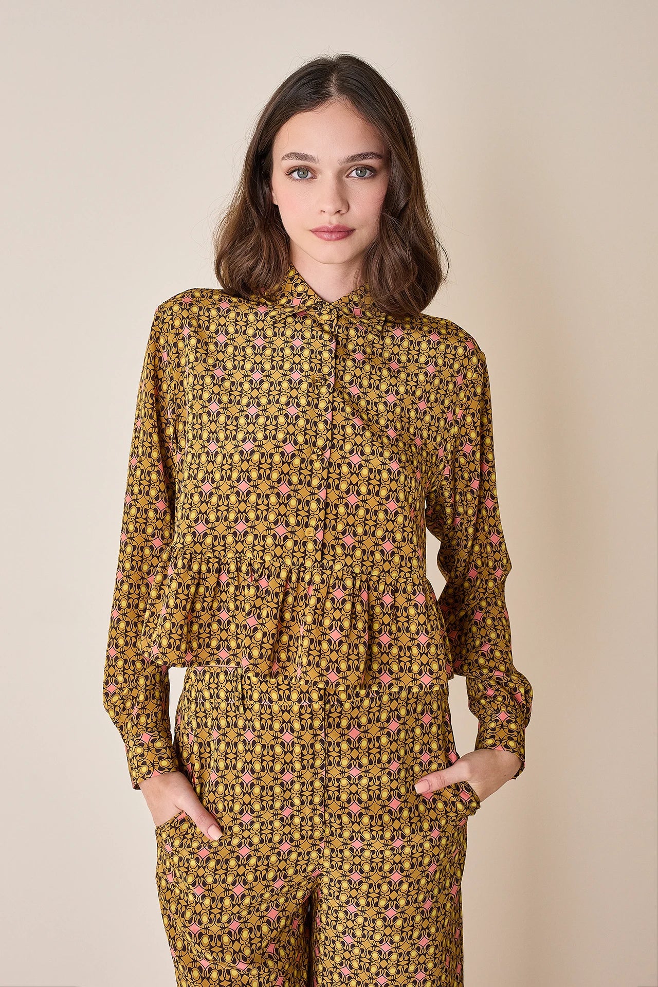 Per questi pantaloni in pura seta abbiamo scelto un prezioso tessuto Liberty Fabrics. Protagonista il motivo a piastrelle specchiate, ispirato a una serie di schizzi di gioielli realizzati per Liberty dai designer Jessie M. King e Archibald Knox, pionieri del movimento Arts & Crafts. Abbinali alla camicia realizzata nello stesso tessuto per un completo di impatto, oppure spezzali con una camicia tinta unita o un maglioncino.