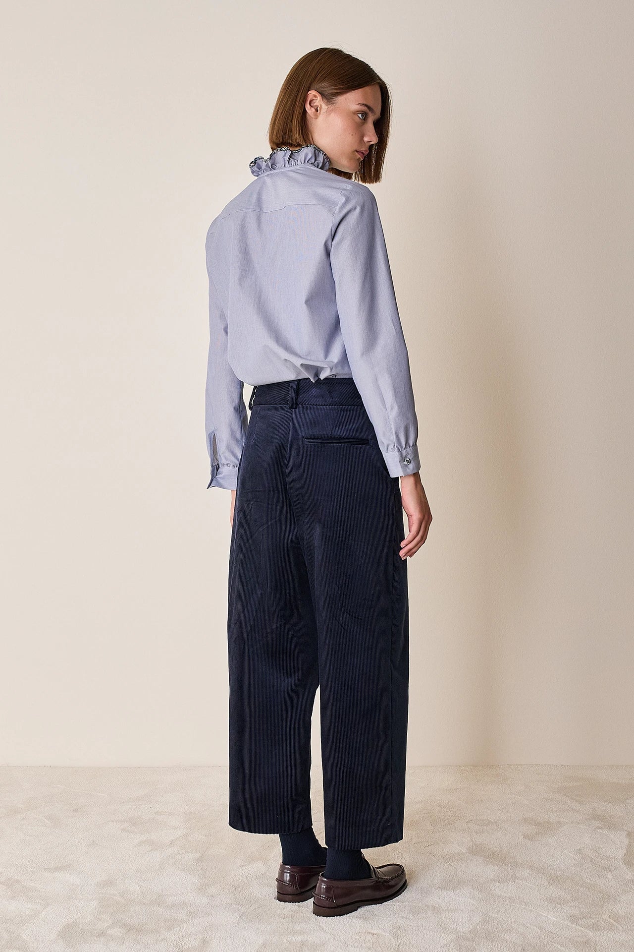 Autunno = pantaloni in velluto a coste. I nostri hanno un taglio dritto a gamba ampia che li rende adatti sia ai mocassini che agli stivaletti. Realizzati in puro velluto di cotone, sono disponibili in blu.
