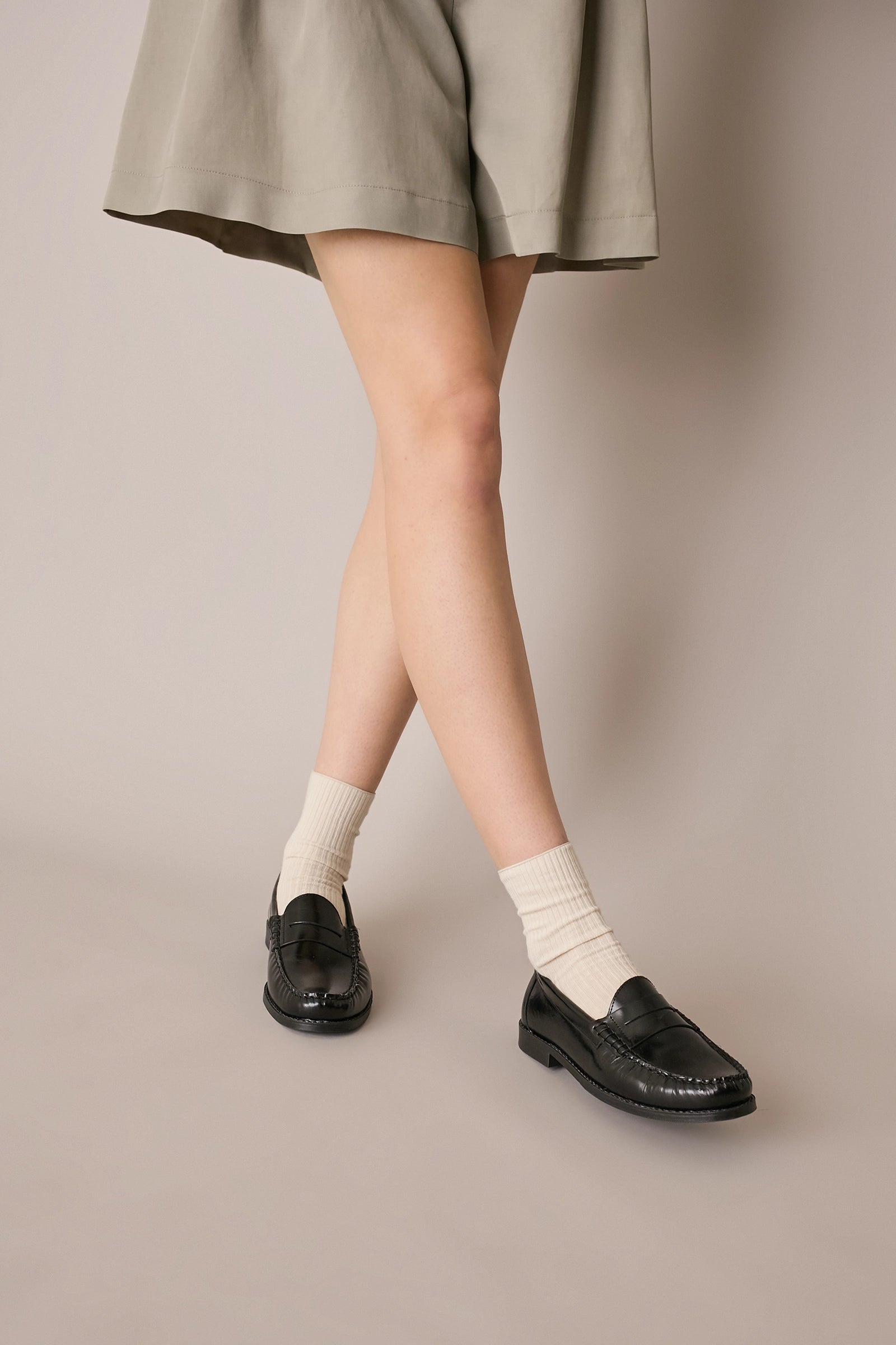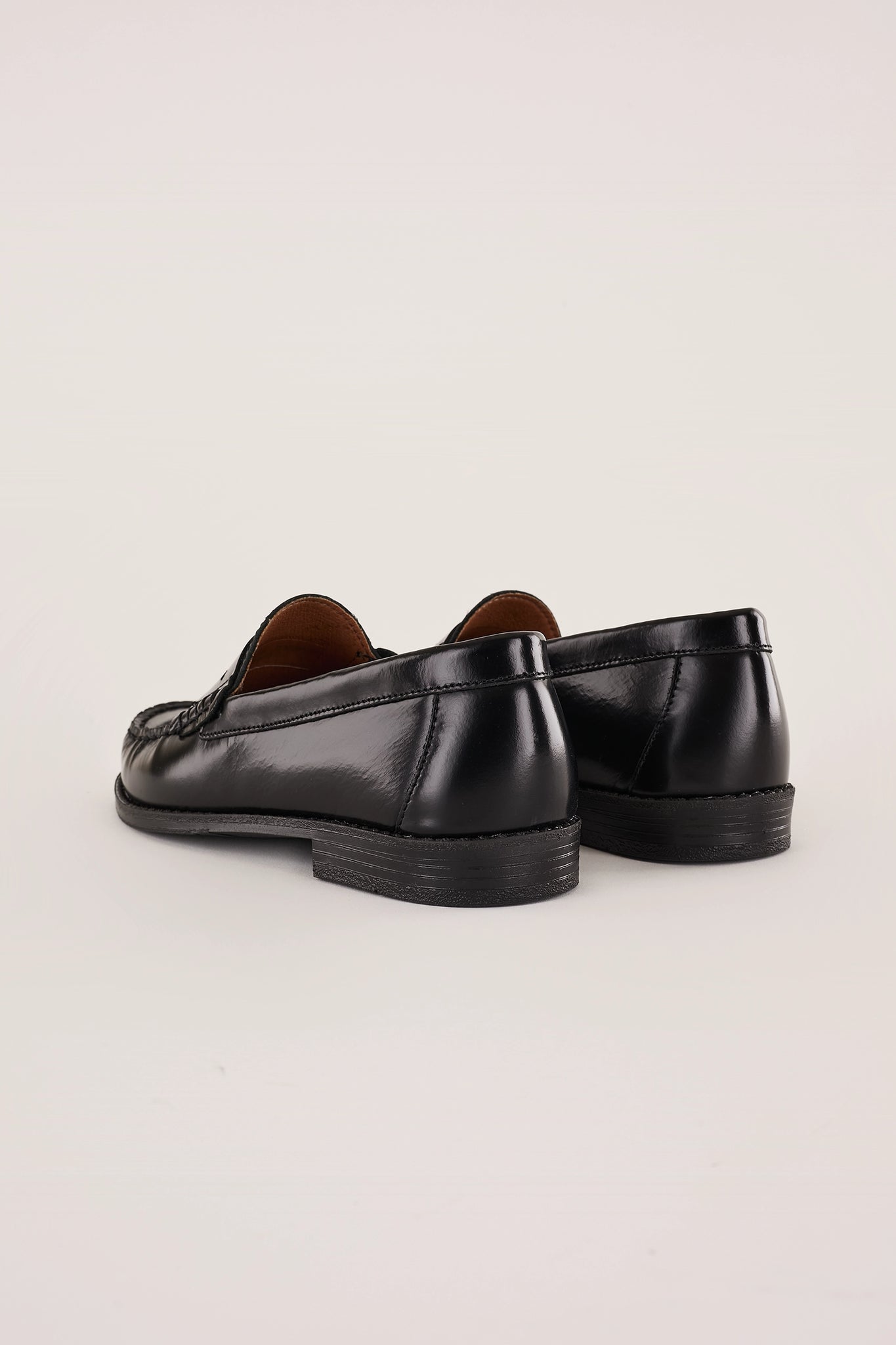 I nostri penny loafers, disponibili in pelle nera, mantengono i dettagli iconici dei modelli originali, come la cucitura moc e l’iconico beefroll.