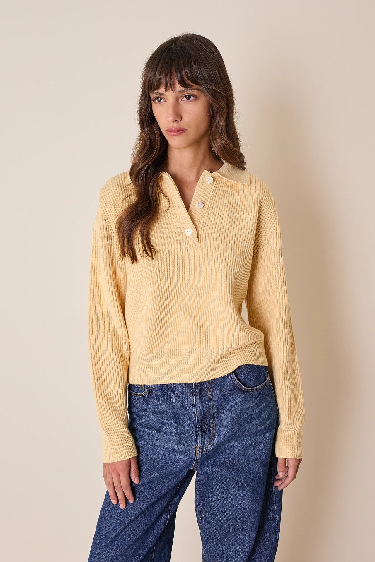 Semplice, versatile e naturalmente calda, questa polo a costine è perfetta sia con i pantaloni che con le gonne. Realizzata in pura lana vergine, è disponibile in giallo.