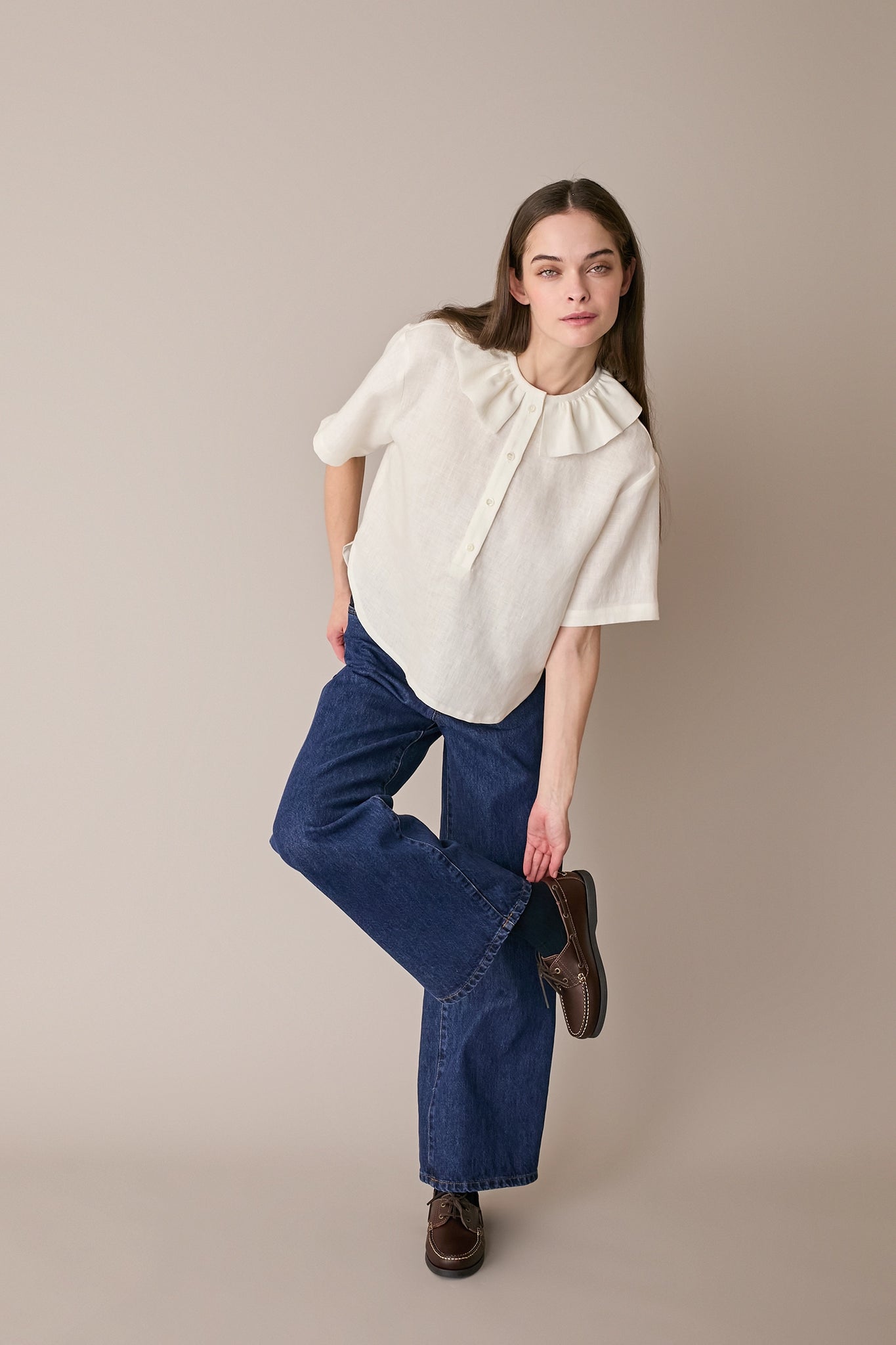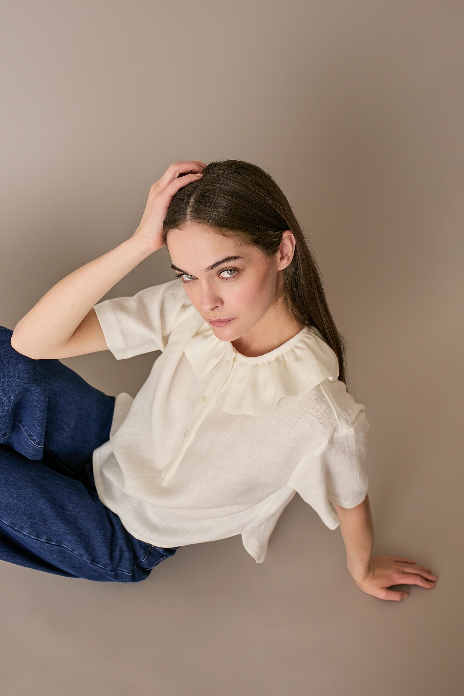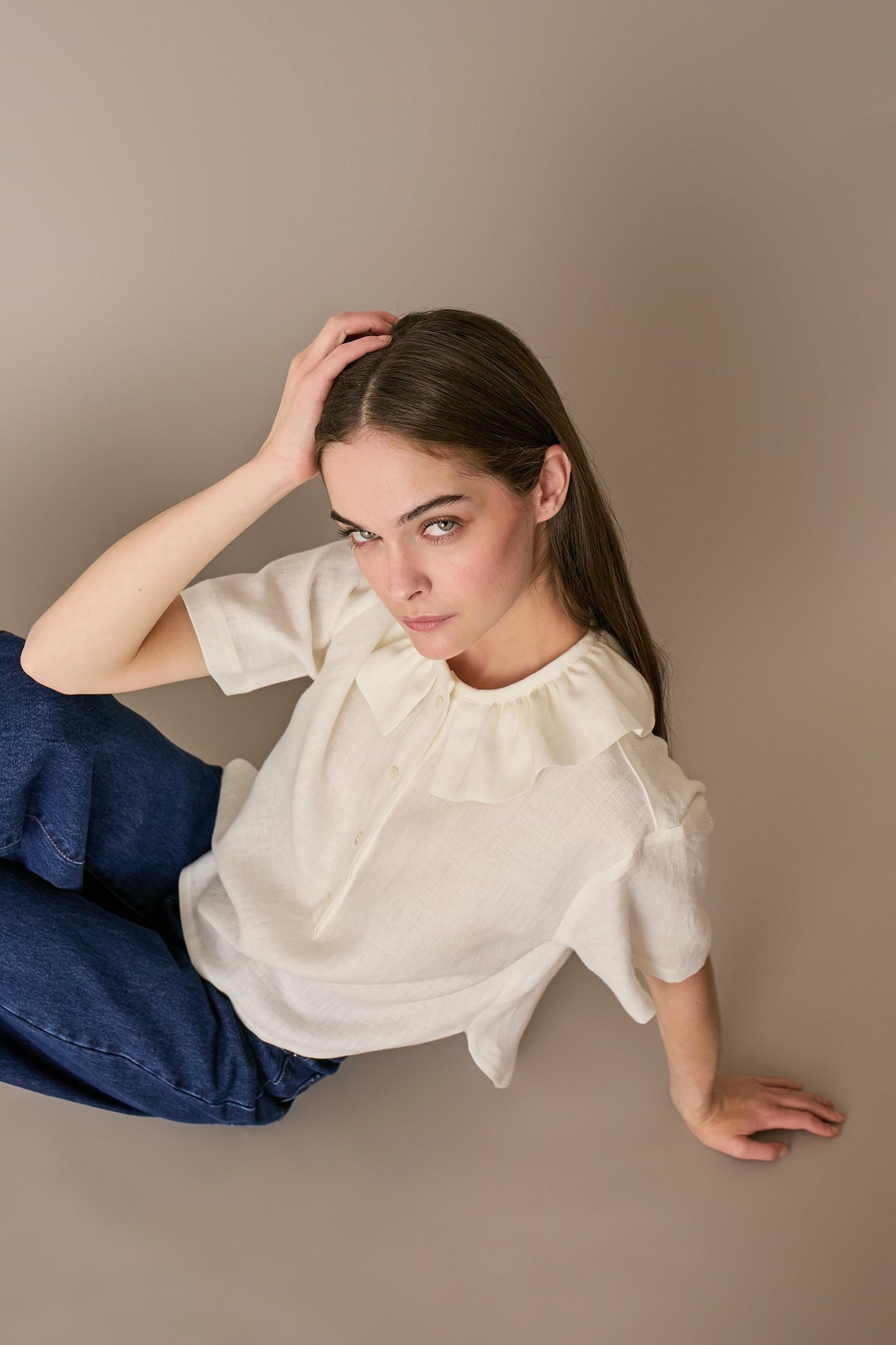 Questa polo in lino è caratterizzata da volant che decorano il girocollo. Sportiva (per il tessuto) ma allo stesso tempo romantica (per il dettaglio dei volant), può essere indossata sia con pantaloni sia con gonne o shorts. Disponibile in bianco.