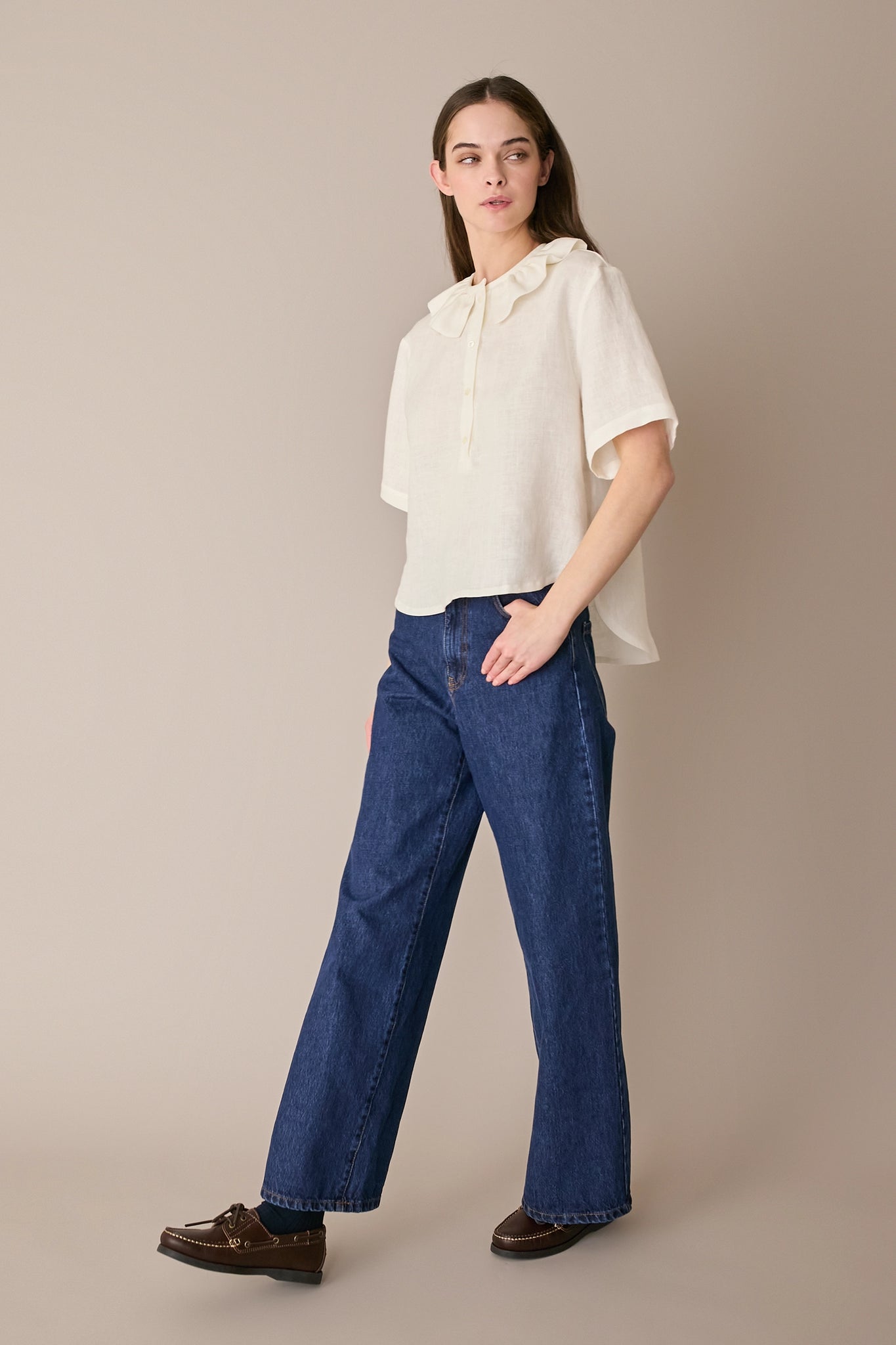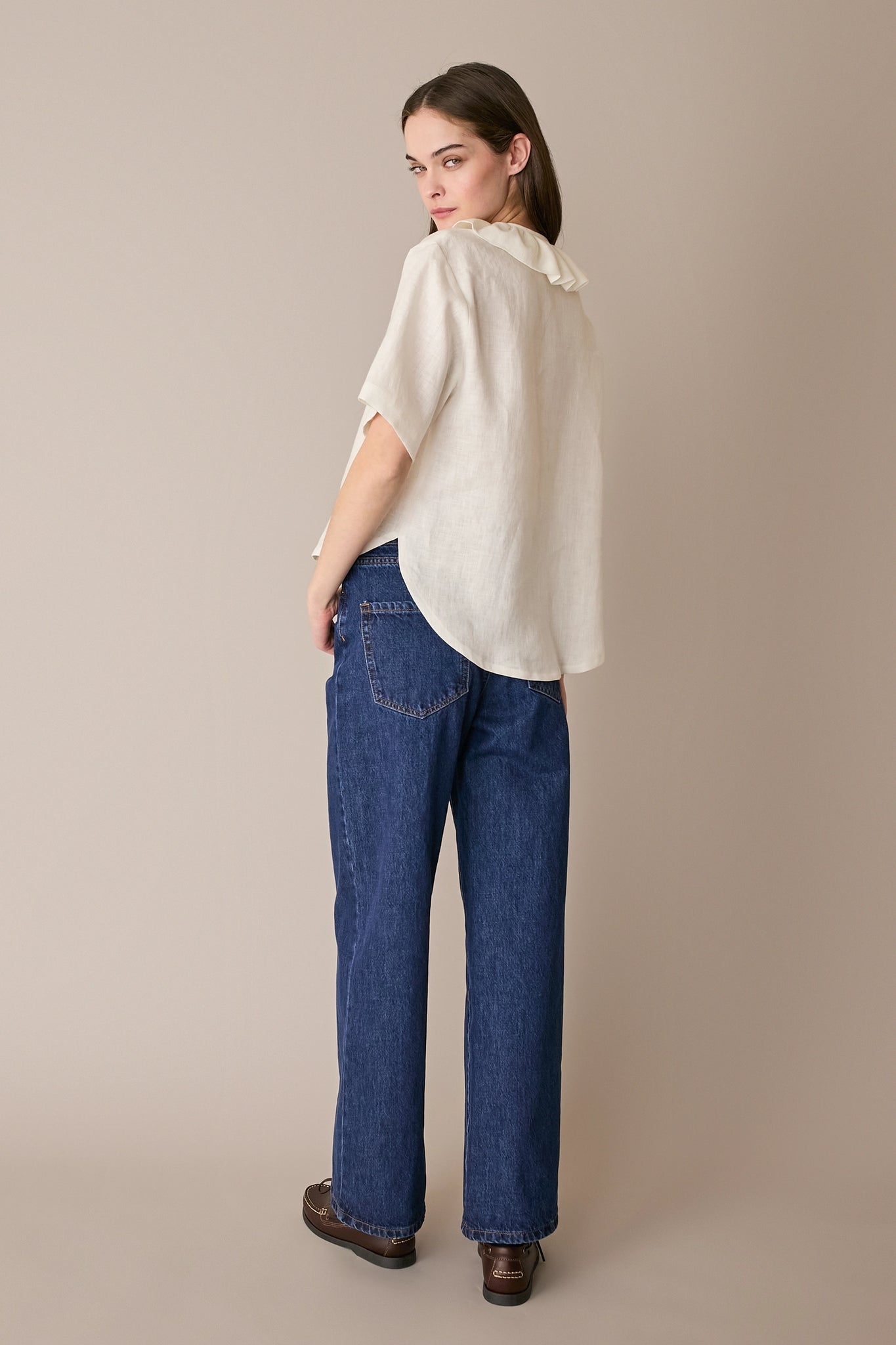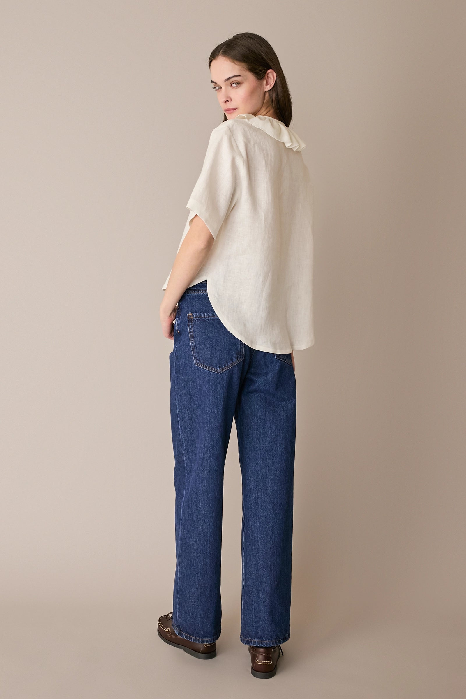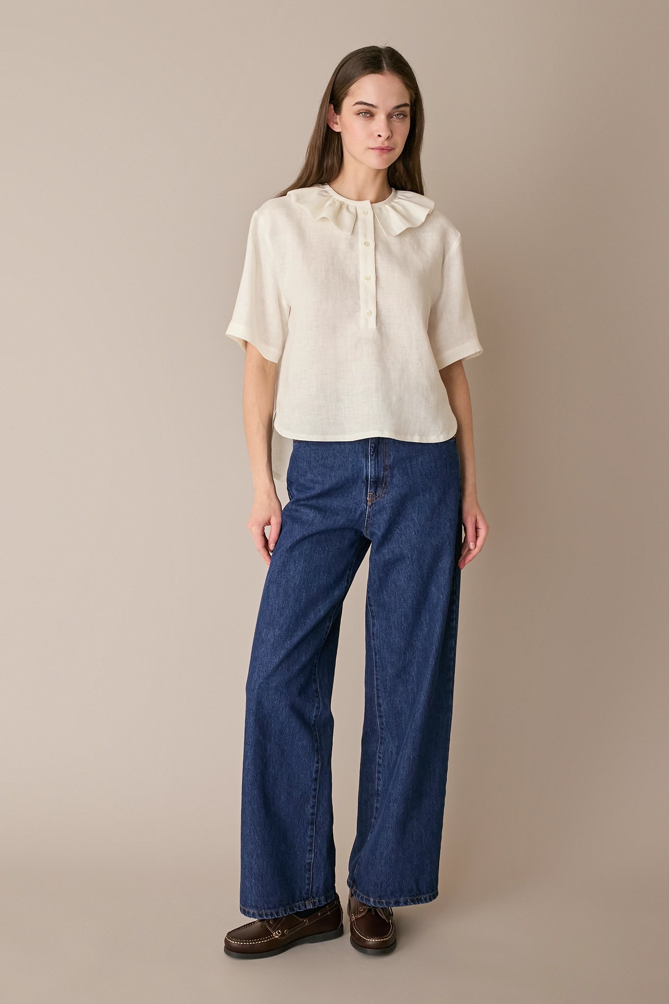 Questa polo in lino è caratterizzata da volant che decorano il girocollo. Sportiva (per il tessuto) ma allo stesso tempo romantica (per il dettaglio dei volant), può essere indossata sia con pantaloni sia con gonne o shorts. Disponibile in bianco.