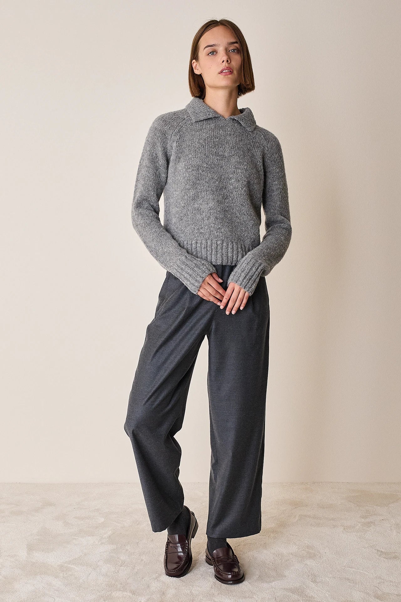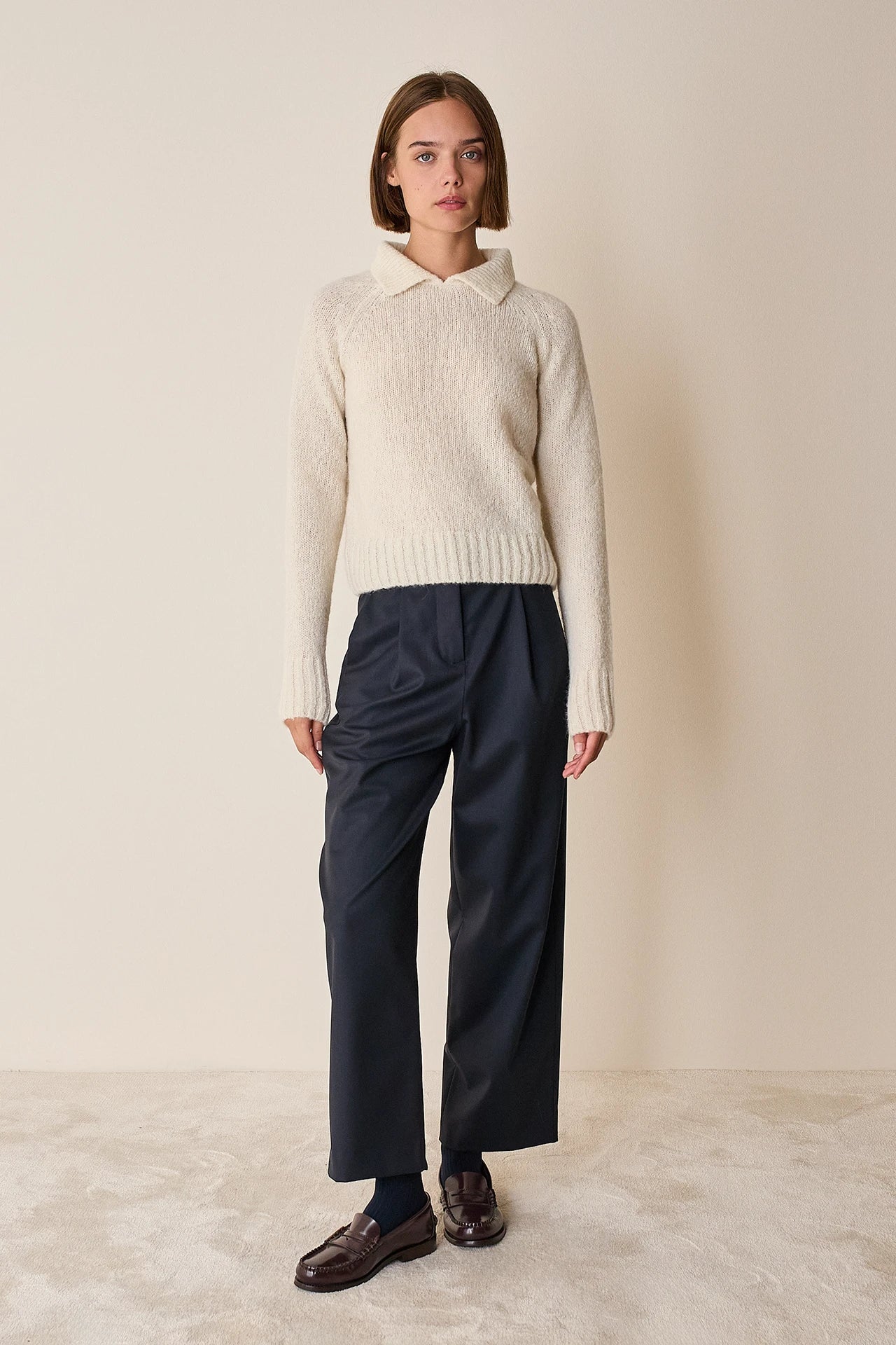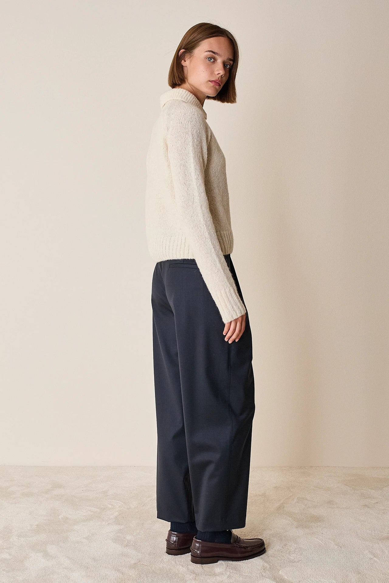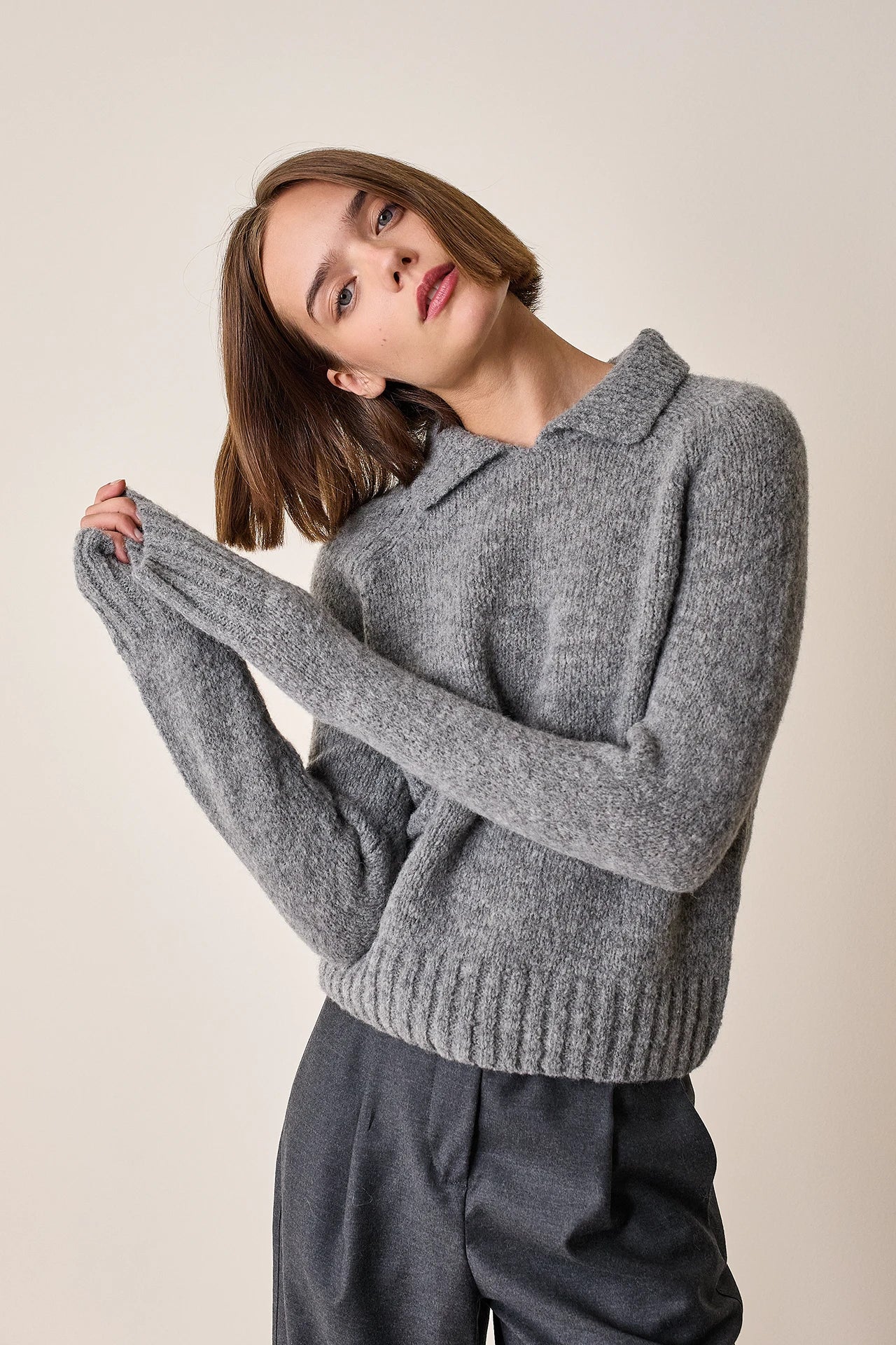 Per questa maglia a polo senza bottoni abbiamo scelto un filato caldo e morbidissimo dove i protagonisti sono baby alpaca e lana merino extrafine. Le maniche raglan e il colletto a polo senza bottoni le aggiungono un tocco più casual, rendendola perfetta sia per le gonne che per i jeans. Disponibile in blu, grigio o panna.