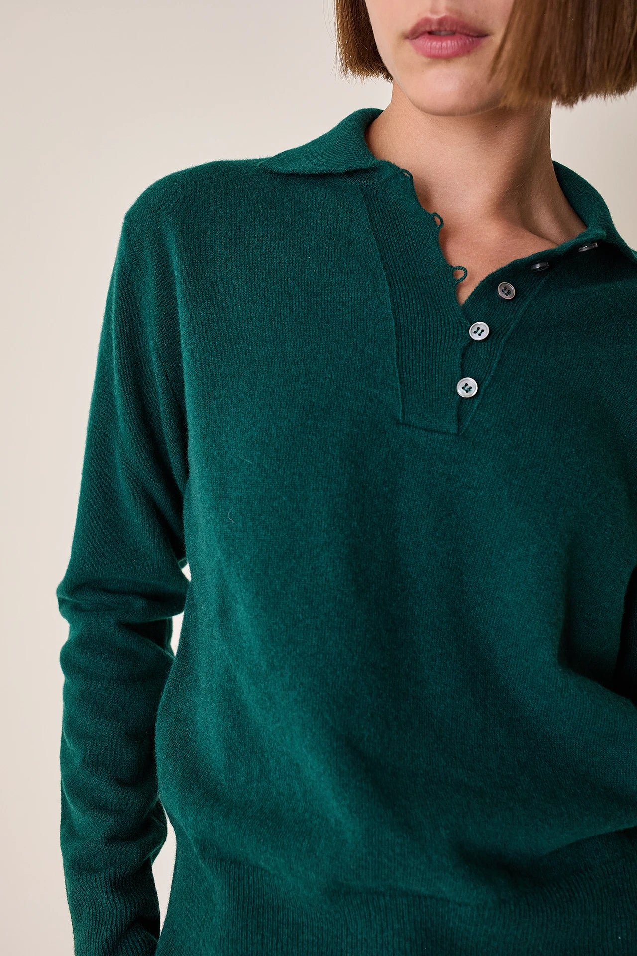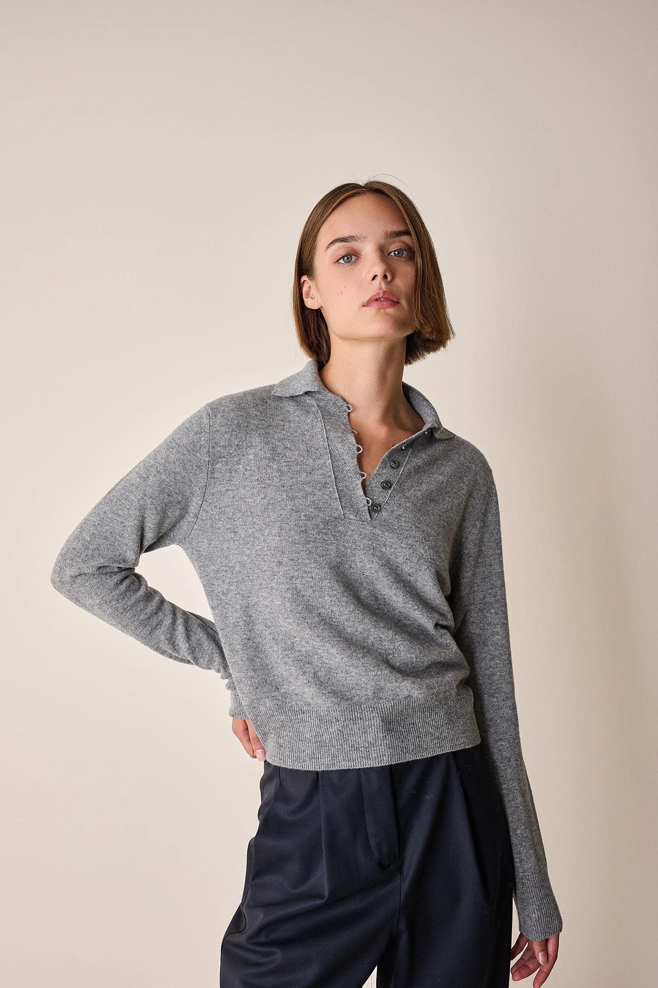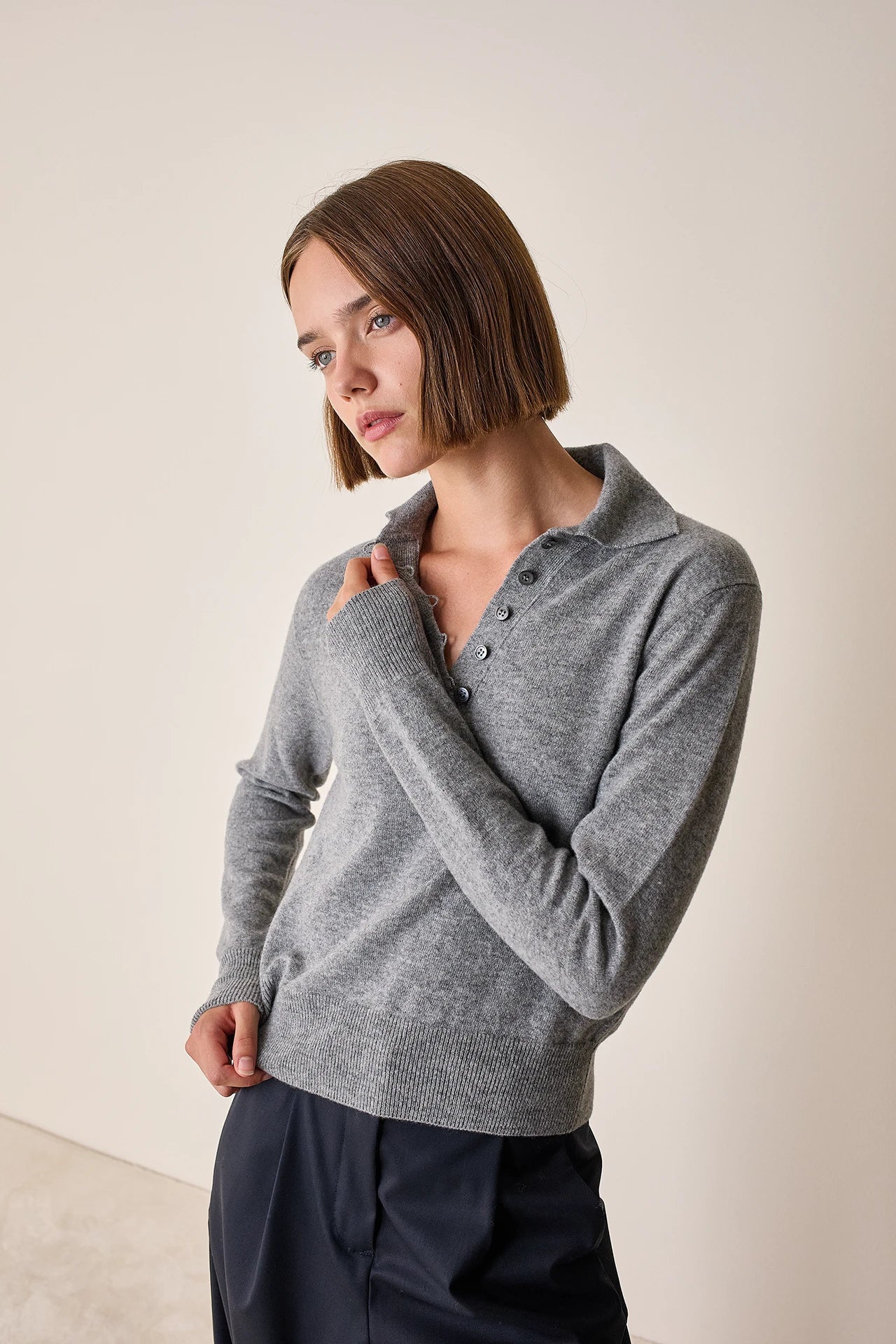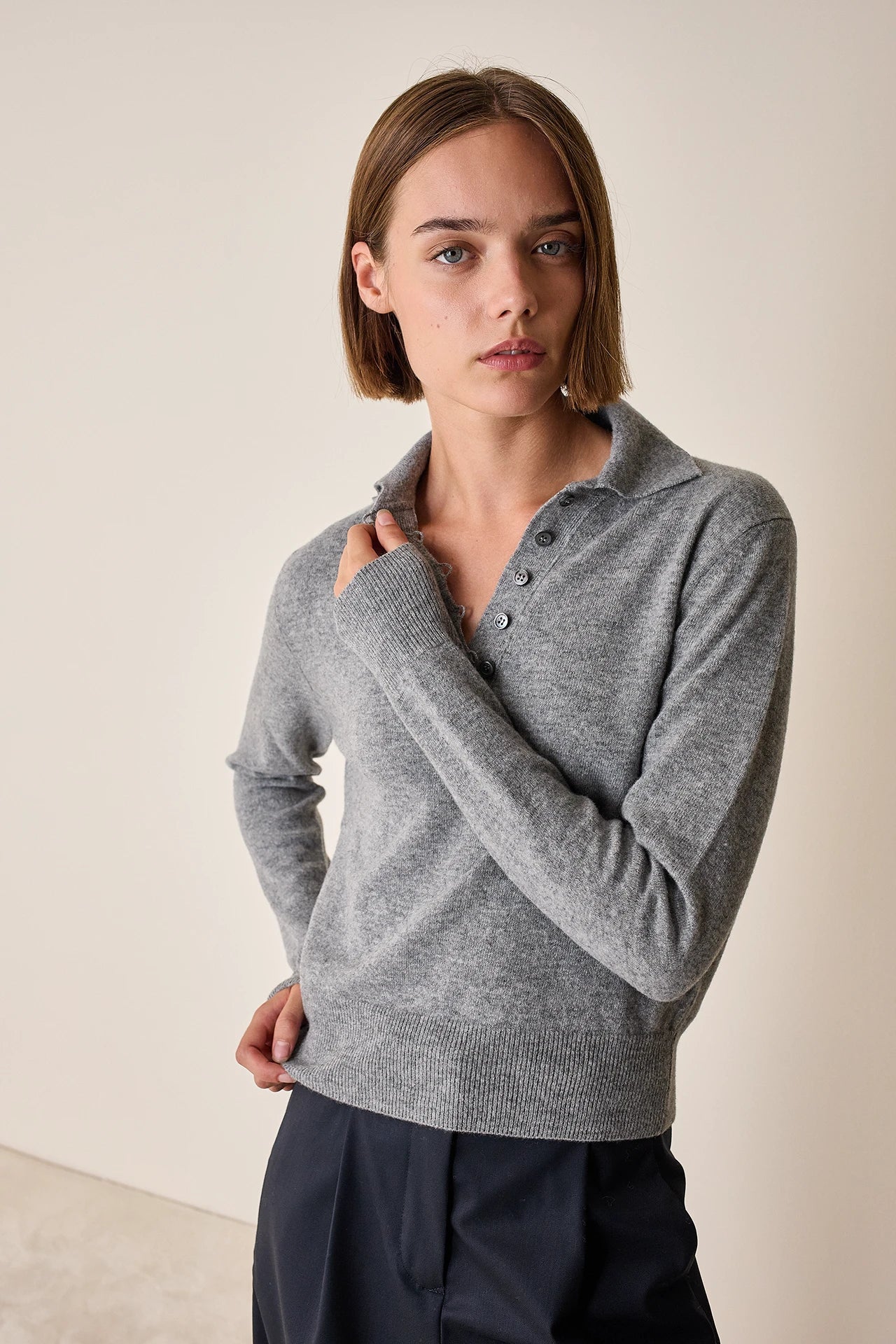Per questa polo abbiamo scelto un filato Camberra superfine, naturalmente caldo ma sottile, e il dettaglio delle asole esterne in maglia. Disponibile in azzurro, verde, grigio o rubino.
