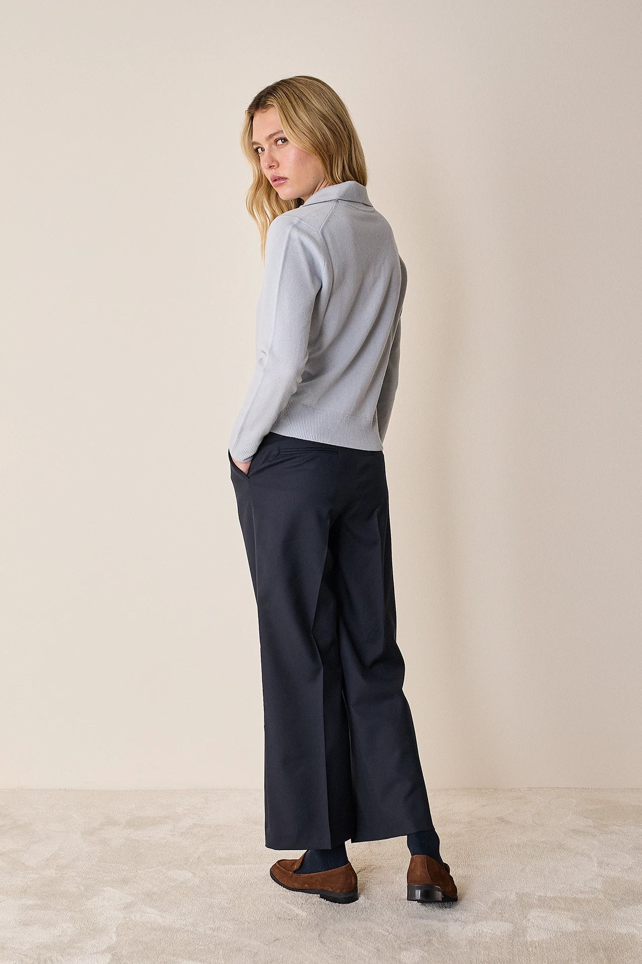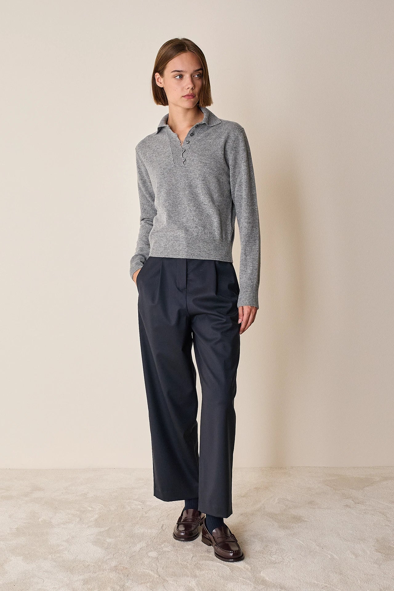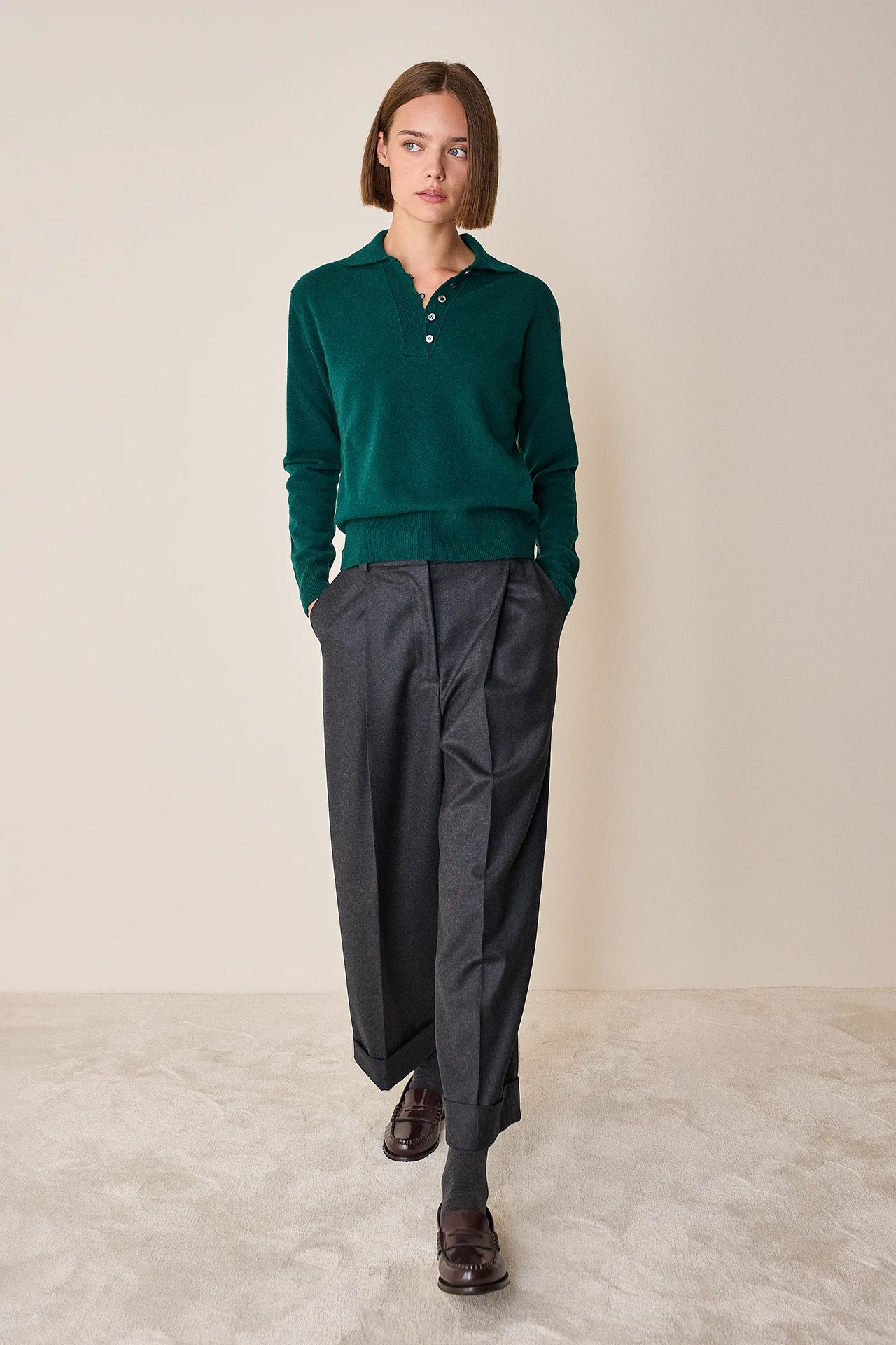 Per questa polo abbiamo scelto un filato Camberra superfine, naturalmente caldo ma sottile, e il dettaglio delle asole esterne in maglia. Disponibile in azzurro, verde, grigio o rubino.