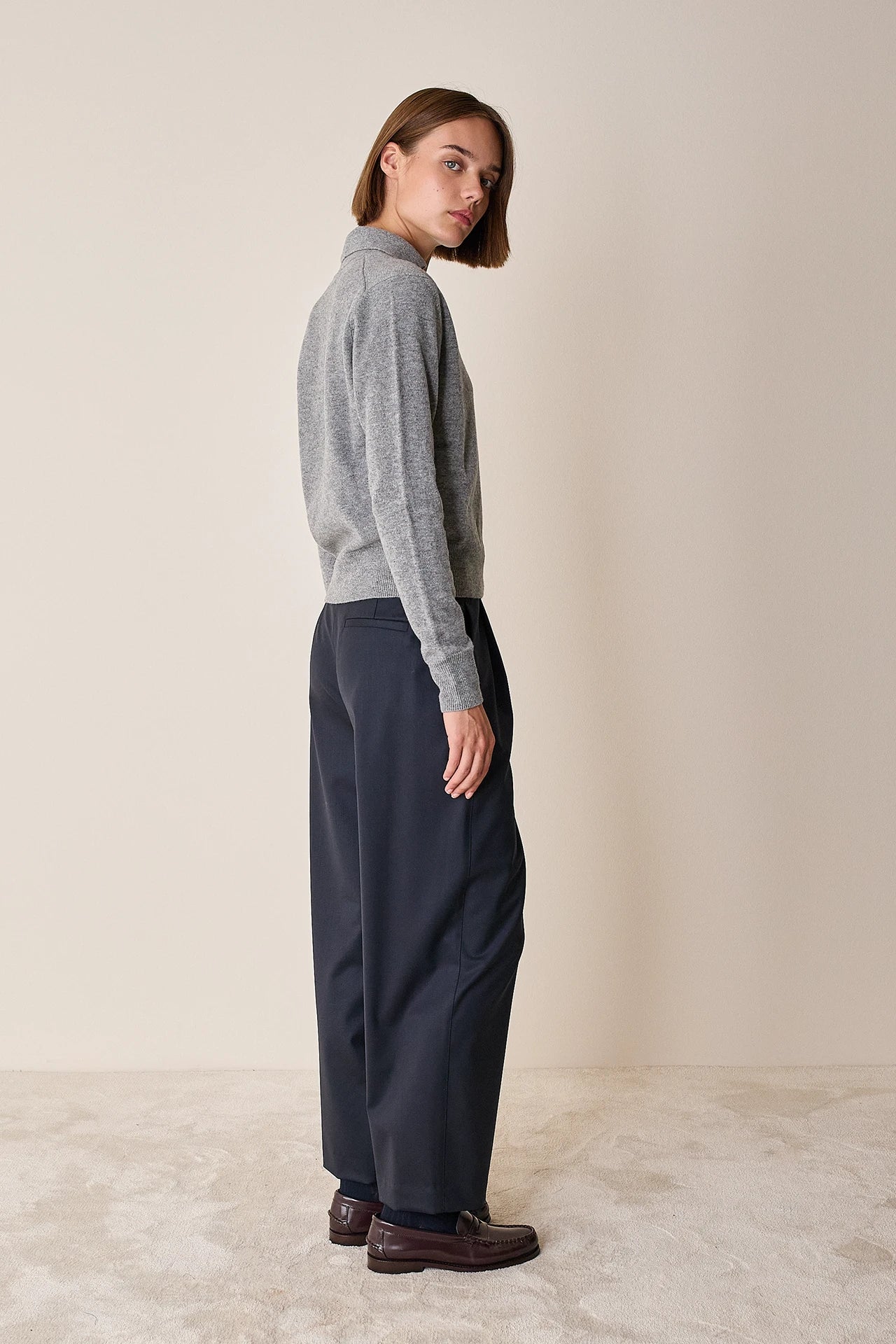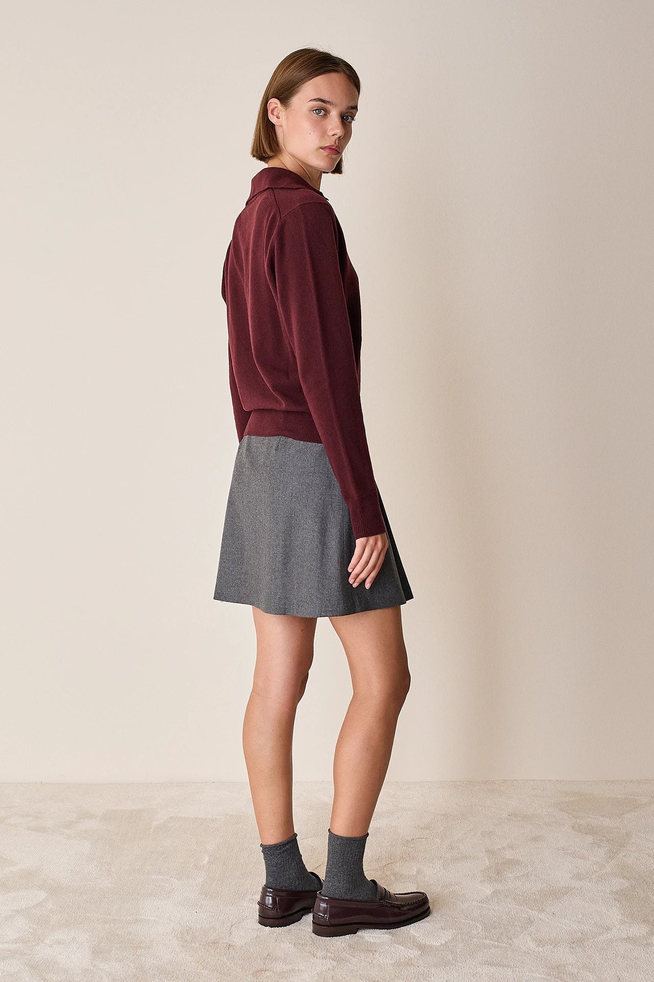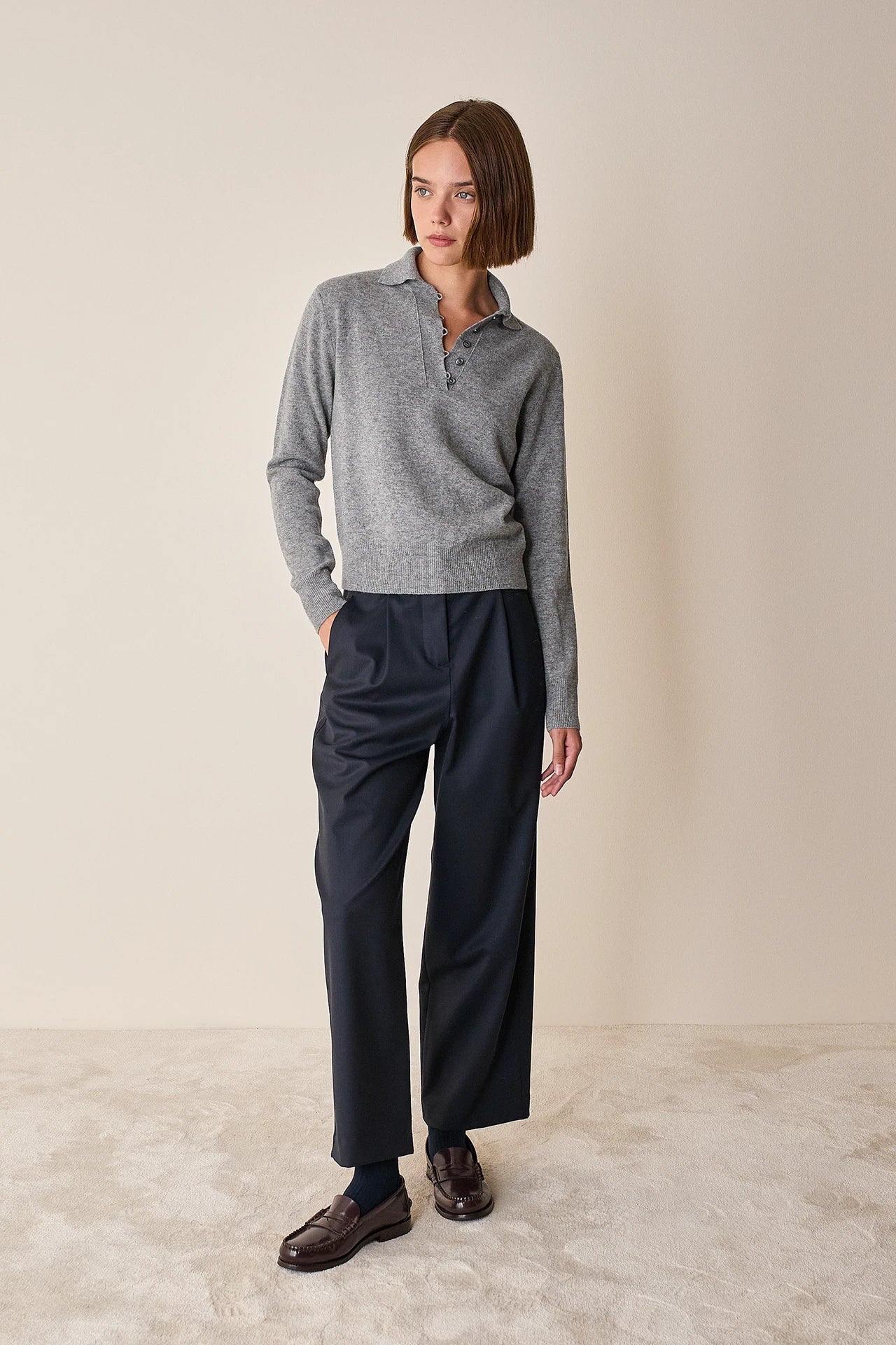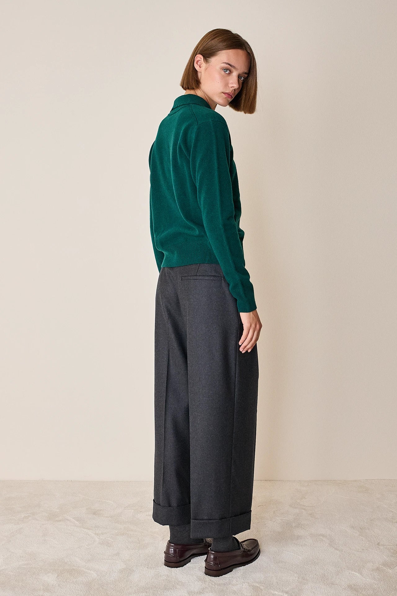 Per questa polo abbiamo scelto un filato Camberra superfine, naturalmente caldo ma sottile, e il dettaglio delle asole esterne in maglia. Disponibile in azzurro, verde, grigio o rubino.