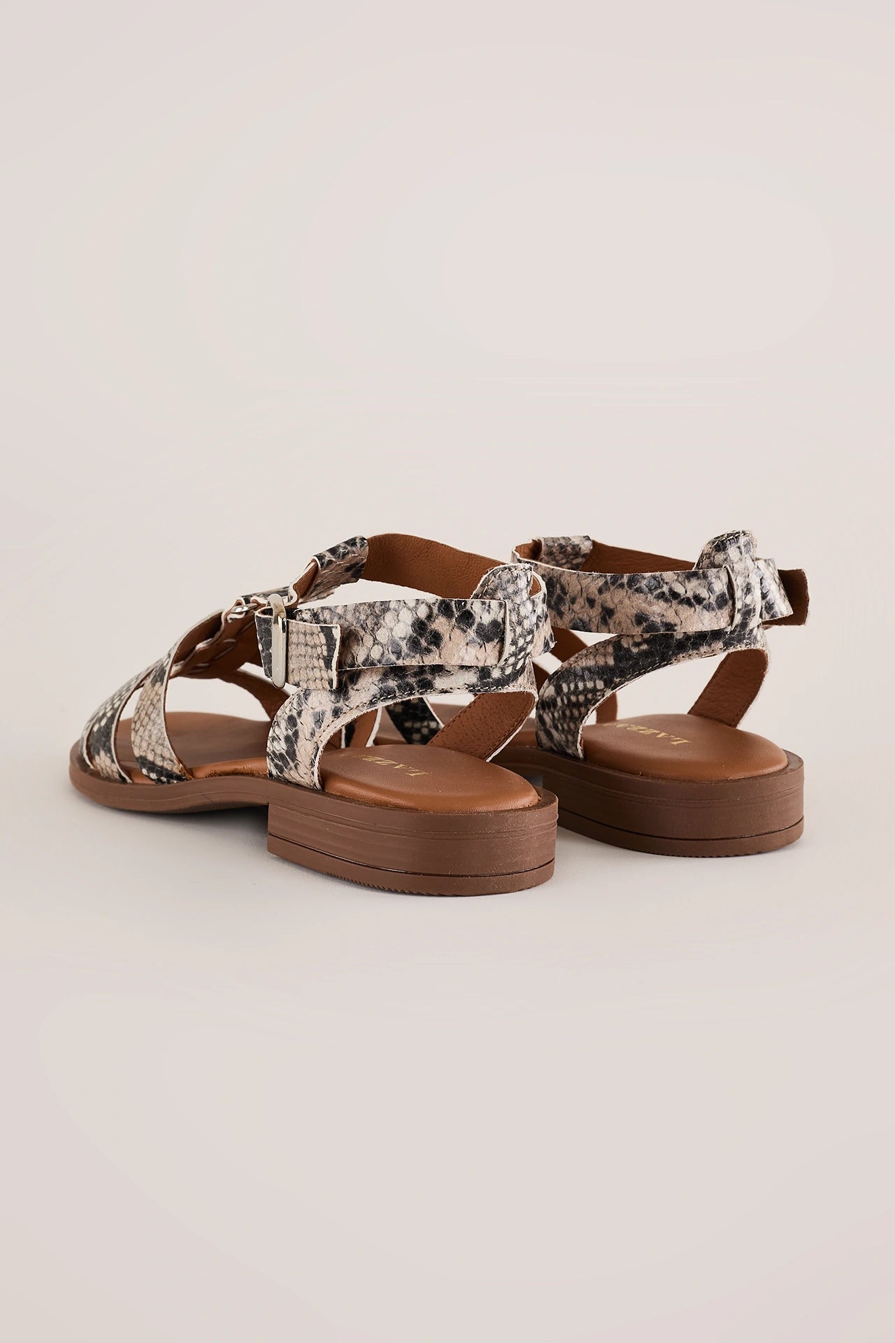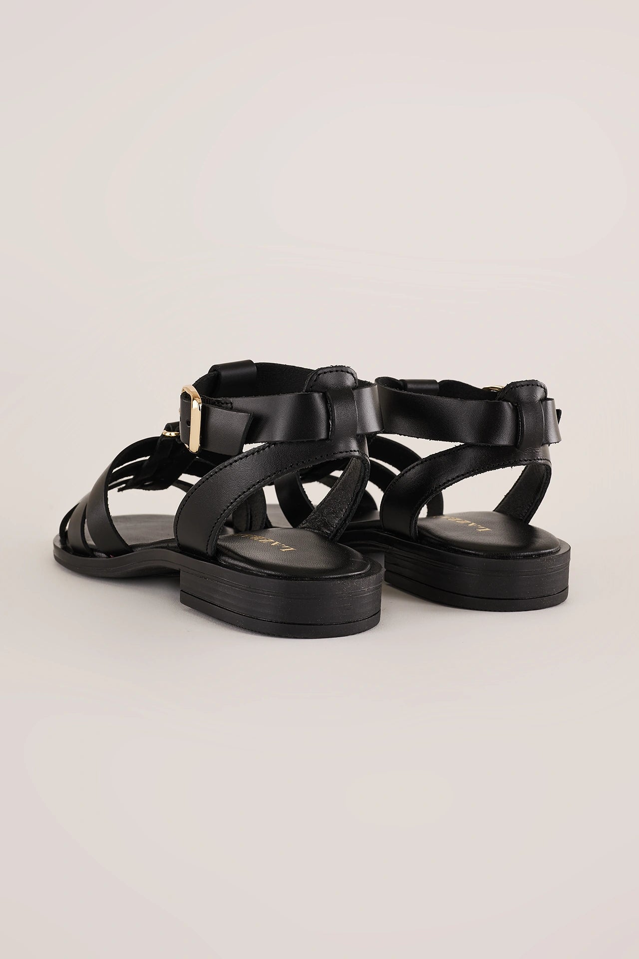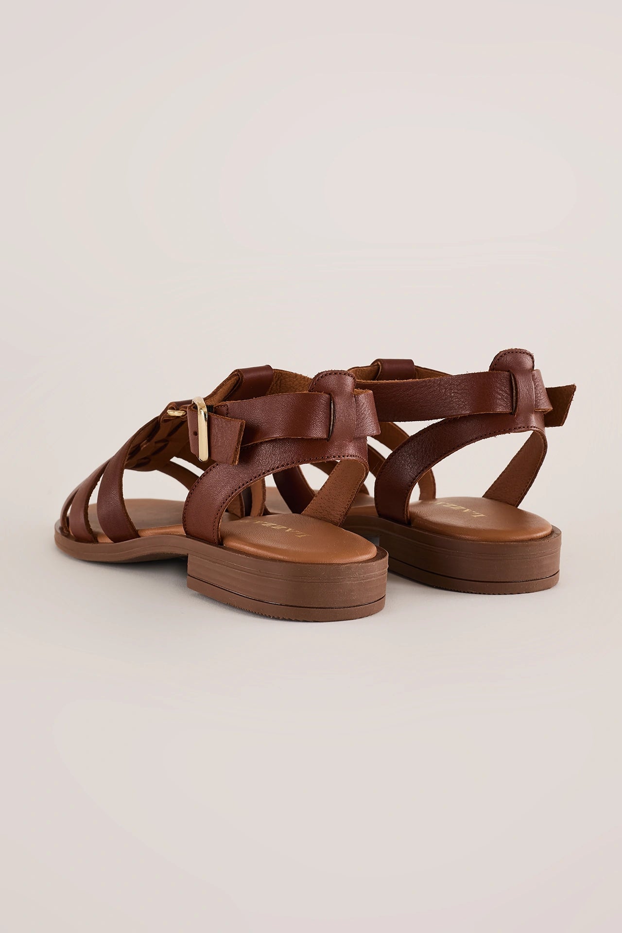 Questi sandali in pelle reinterpretano lo stile gladiatore con un design essenziale a fasce larghe intrecciate. Il cinturino regolabile alla caviglia garantisce una calzata stabile, mentre la soletta imbottita assicura comfort fin dal primo utilizzo. Versatili e facili da abbinare, sono disponibili in nappa nera, nappa cognac e pelle effetto pitone.