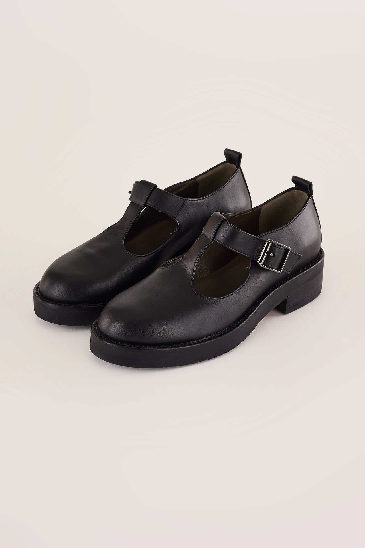 Queste scarpe t-bar con occhietti cut-out sono ispirate alle scarpe della nostra infanzia. Disponibili in nero.