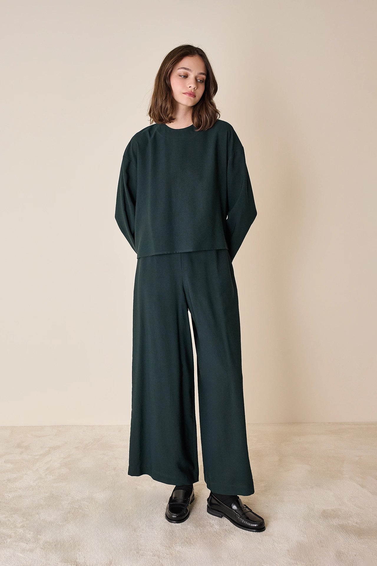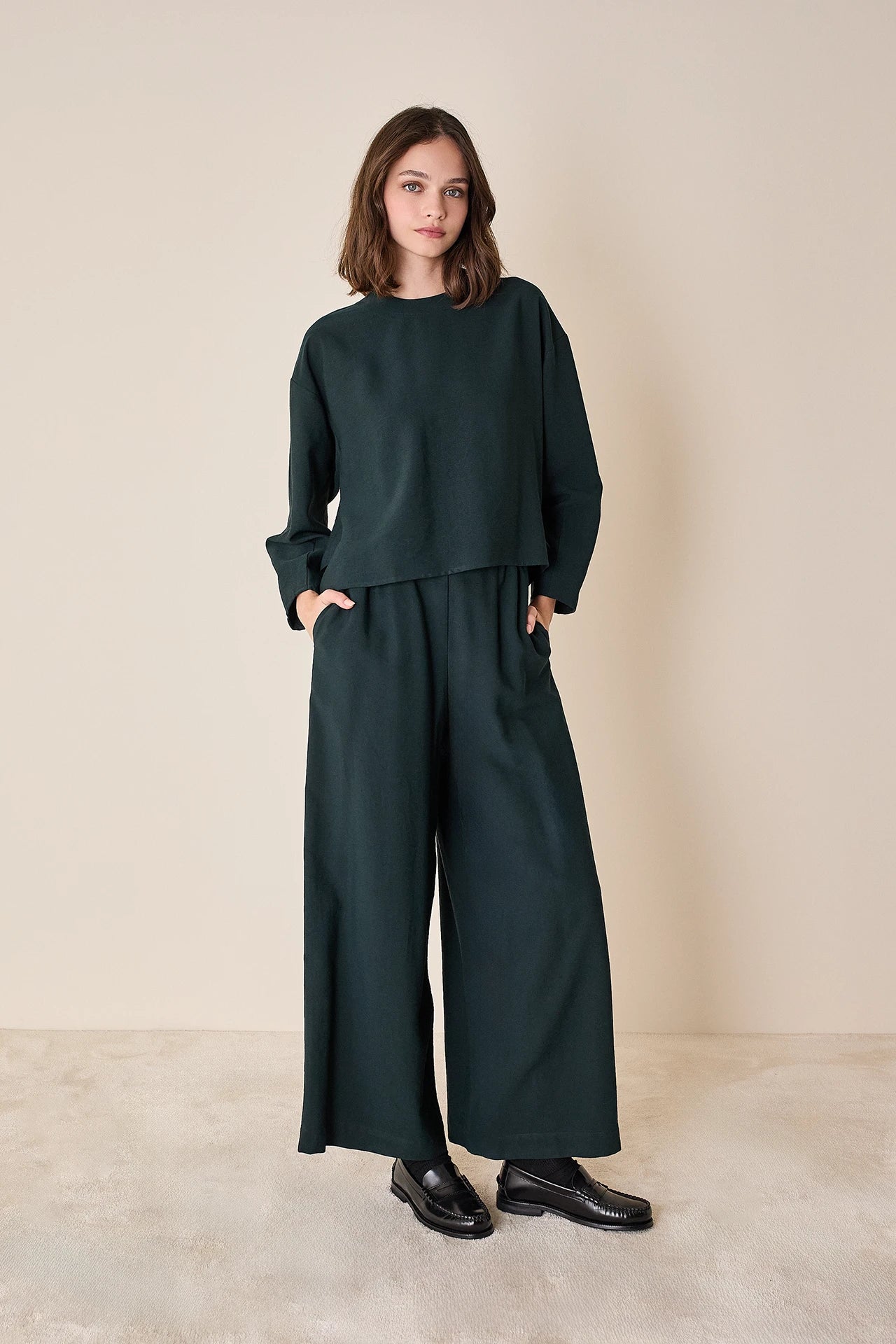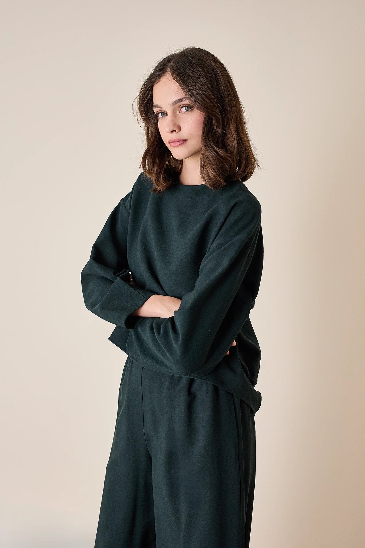 To match or not to match? Questo top a maniche lunghe può essere abbinato ai pantaloni con elastico realizzati nello stesso tessuto, ma è perfetto anche con jeans, shorts in lana e minigonne. Disponibile in noce, verde petrolio o blu notte.