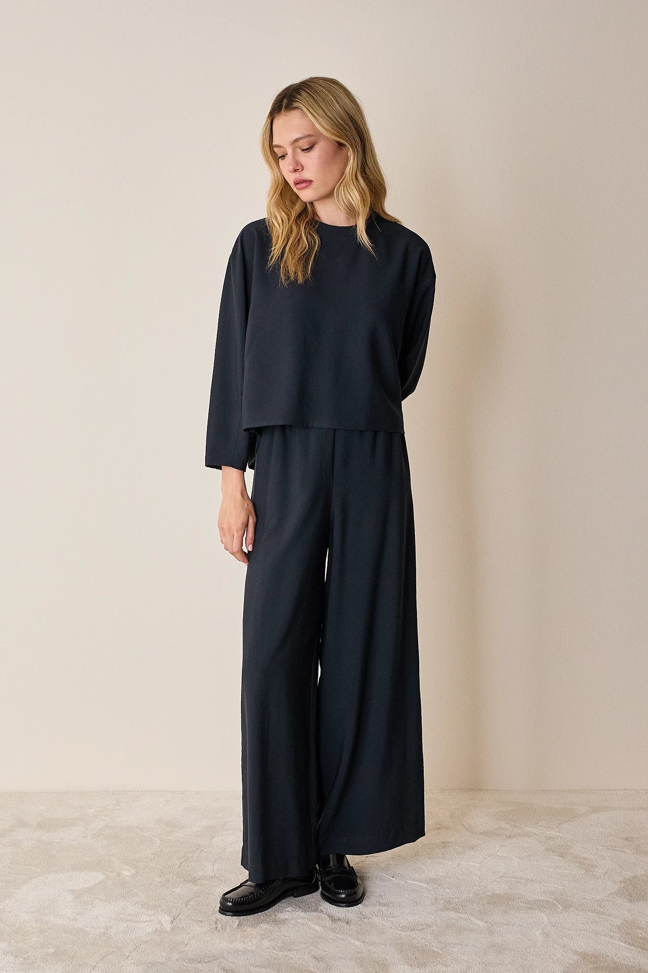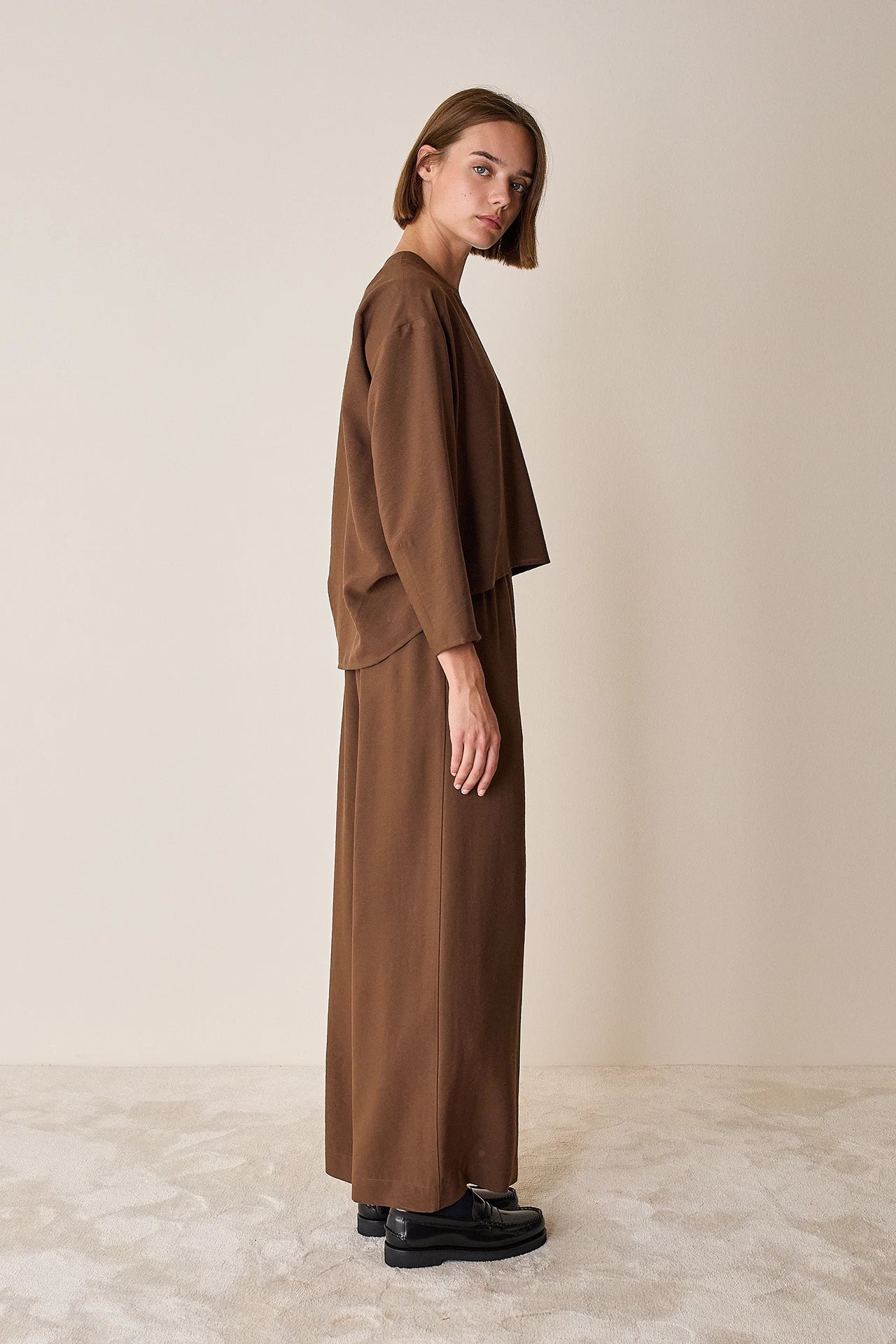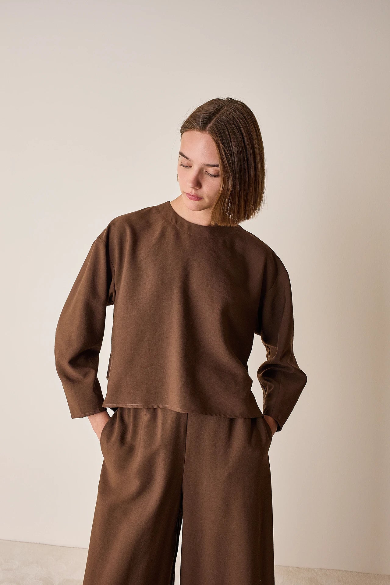 To match or not to match? Questo top a maniche lunghe può essere abbinato ai pantaloni con elastico realizzati nello stesso tessuto, ma è perfetto anche con jeans, shorts in lana e minigonne. Disponibile in noce, verde petrolio o blu notte.