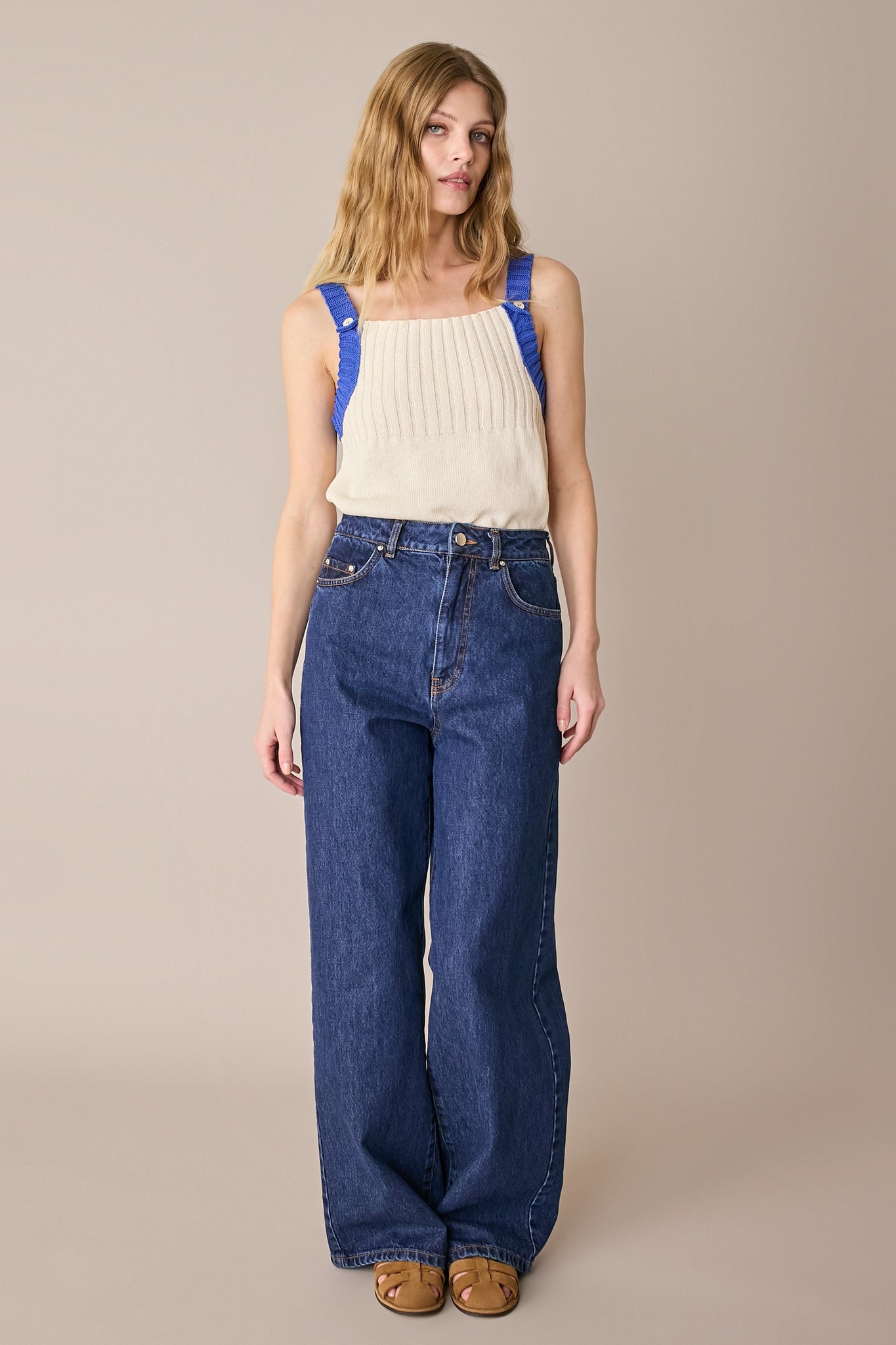Questo top in maglia di cotone è pensato per l’estate. Leggero, fresco e facile da abbinare, è caratterizzato da spalline a contrasto con bottoncini.