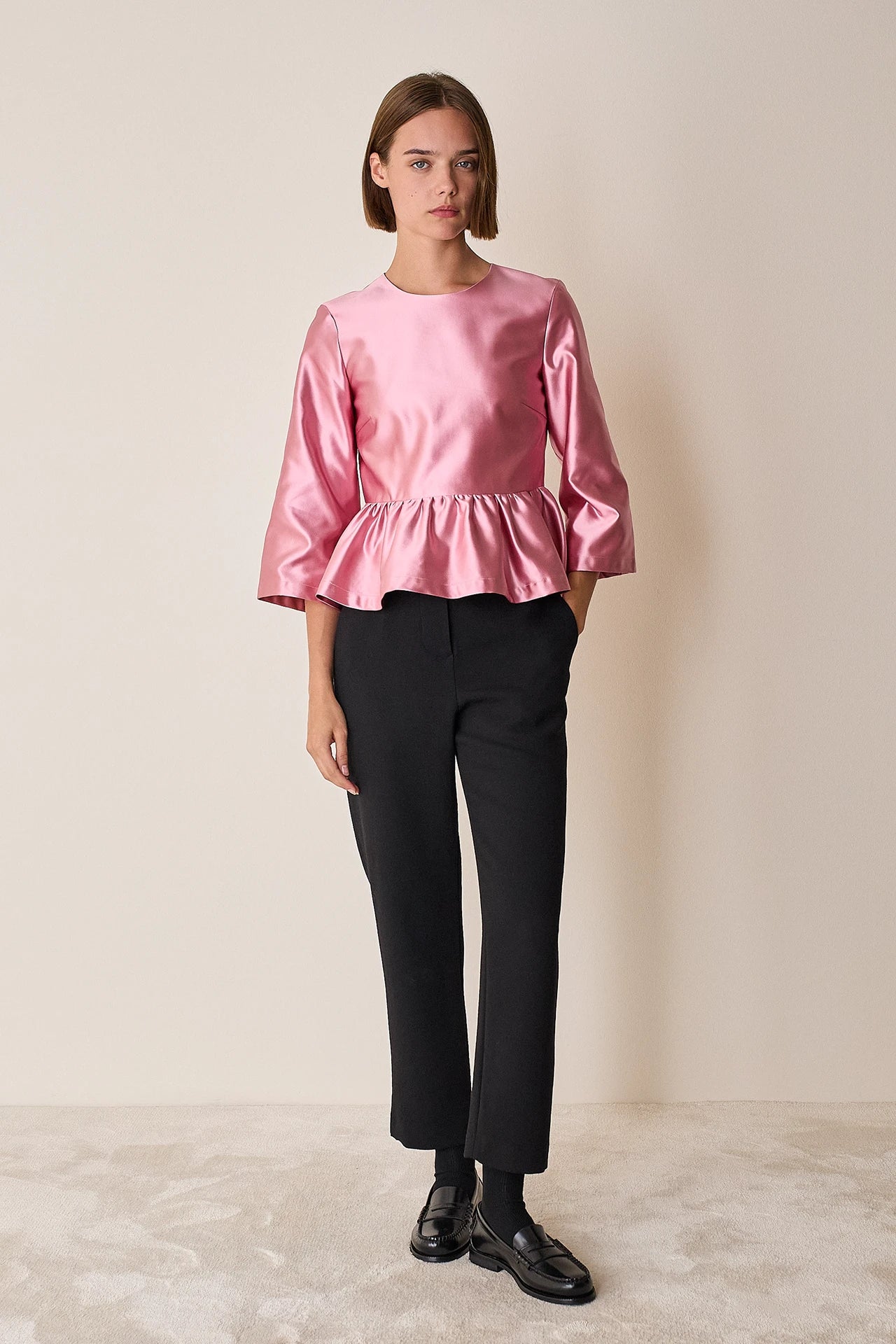 Questo top con maniche a tre quarti è caratterizzato da una grande balza scultorea. Elegante ma versatile, puoi abbinarlo a un paio di pantaloni come a una gonna. Disponibile in un lumino blend di seta e cotone rosa.